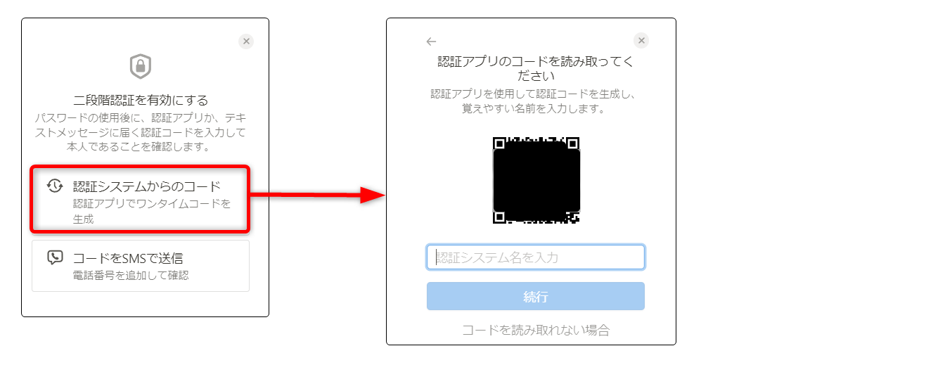 表示されたQRコードを認証アプリで読み取り、認証システム名を入力してください。