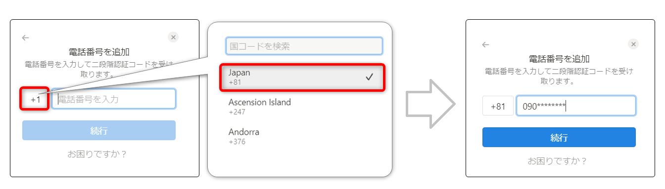 電話番号の国コードがアメリカ(+1)になっているので、日本(+81)に変更します。