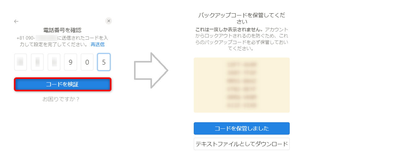 バックアップコードは、二段階認証ができないときの認証コードです。[テキストファイルとしてダウンロード]してファイルを保管するなどして必ず控えておきましょう。