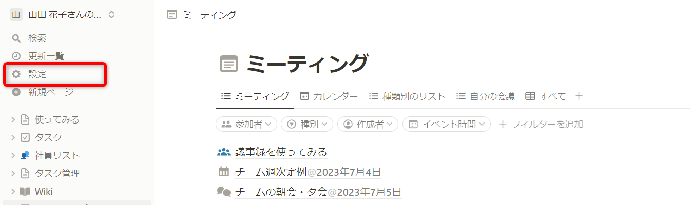 Notionを開き、サイドバーの[設定]をクリックします。