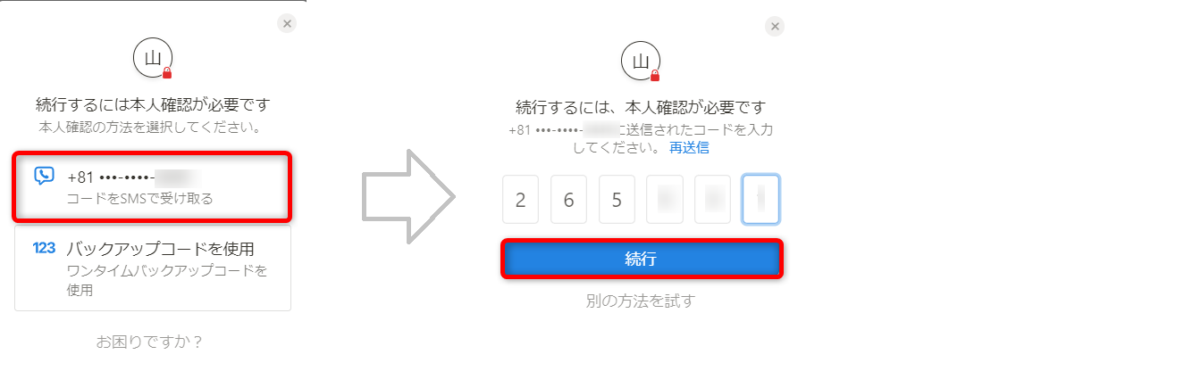 ショートメールに記載されている認証コードを入力し、[続行]をクリックしてください。