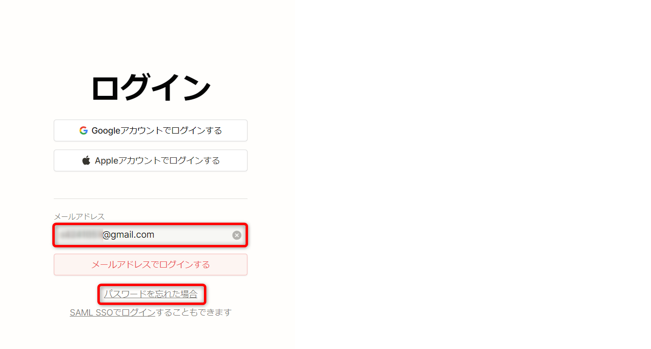 メールアドレスを入力し、[パスワードを忘れた場合]をクリックしてください。