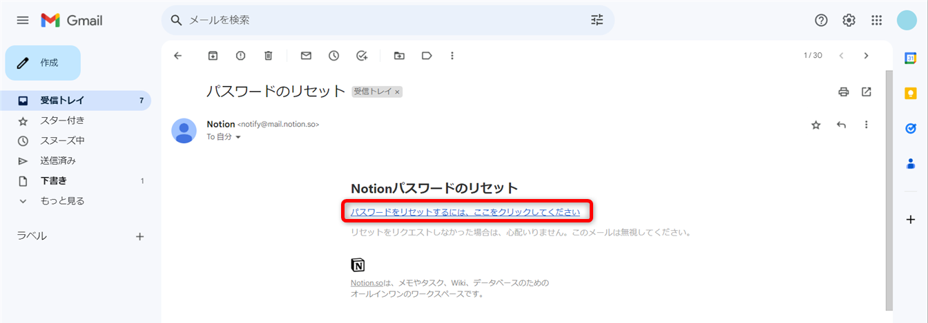 パスワードリセットのメールが届いたら、[パスワードをリセットするには、ここをクリックしてください]をクリックします。