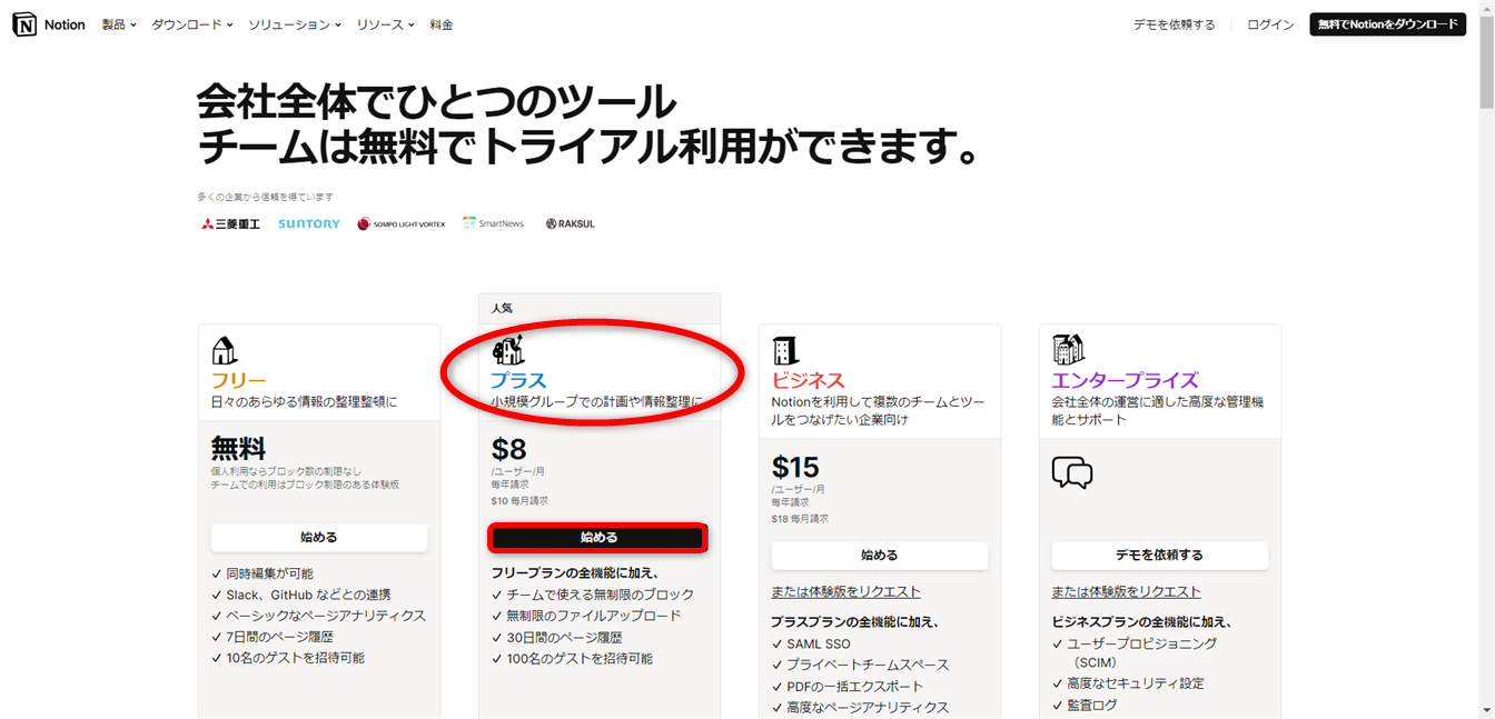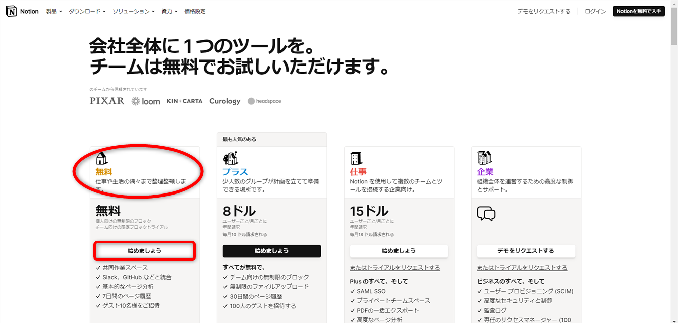 Notionの価格表ページにアクセスし、無料枠の[始めましょう]をクリックします。