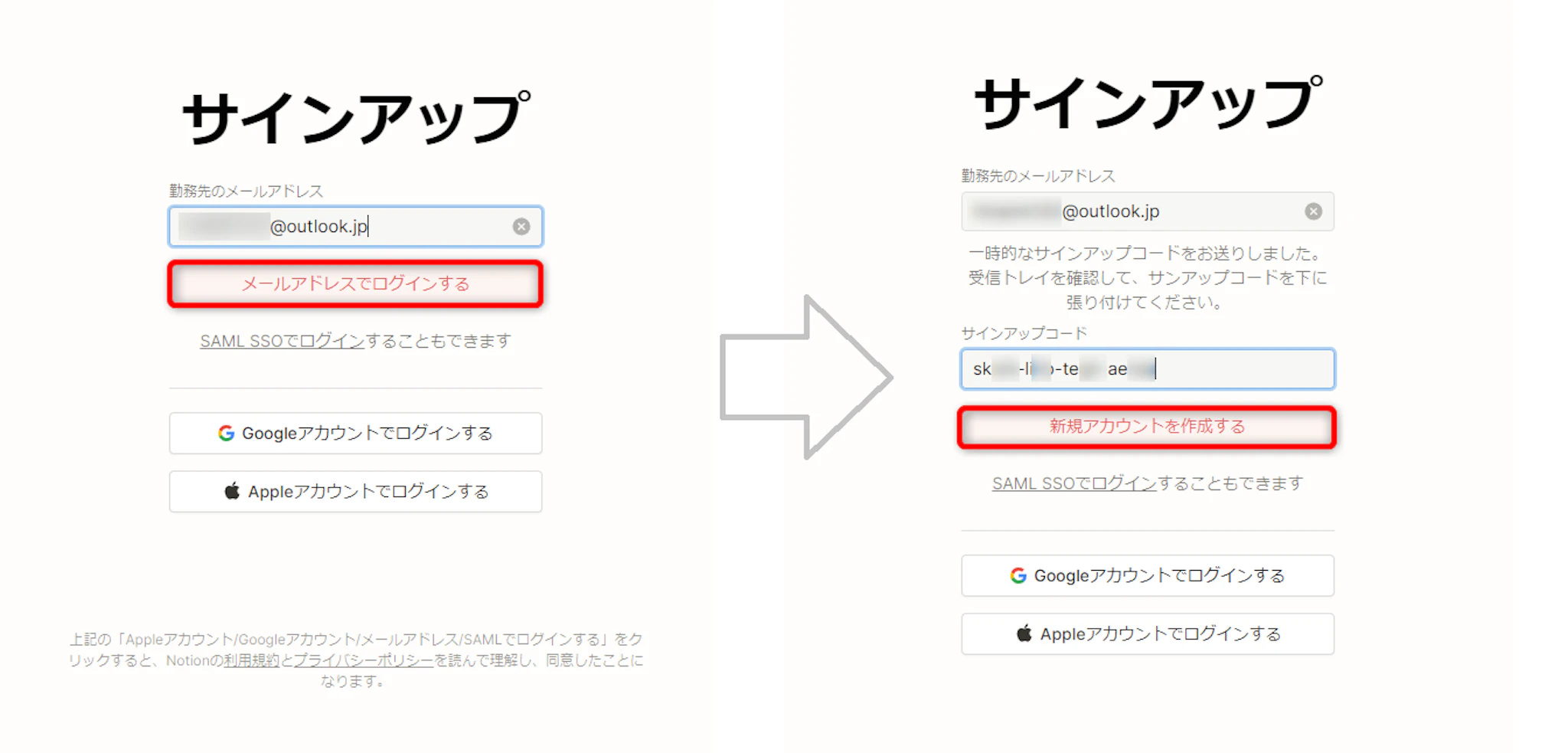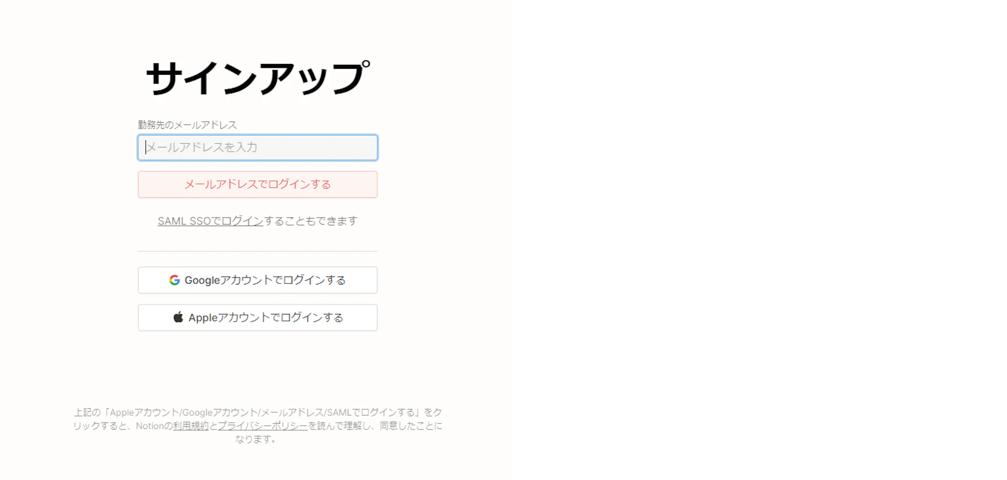 会社など組織のメールアドレス、またはGoogle・AppleアカウントでNotionアカウントを取得しログインします。