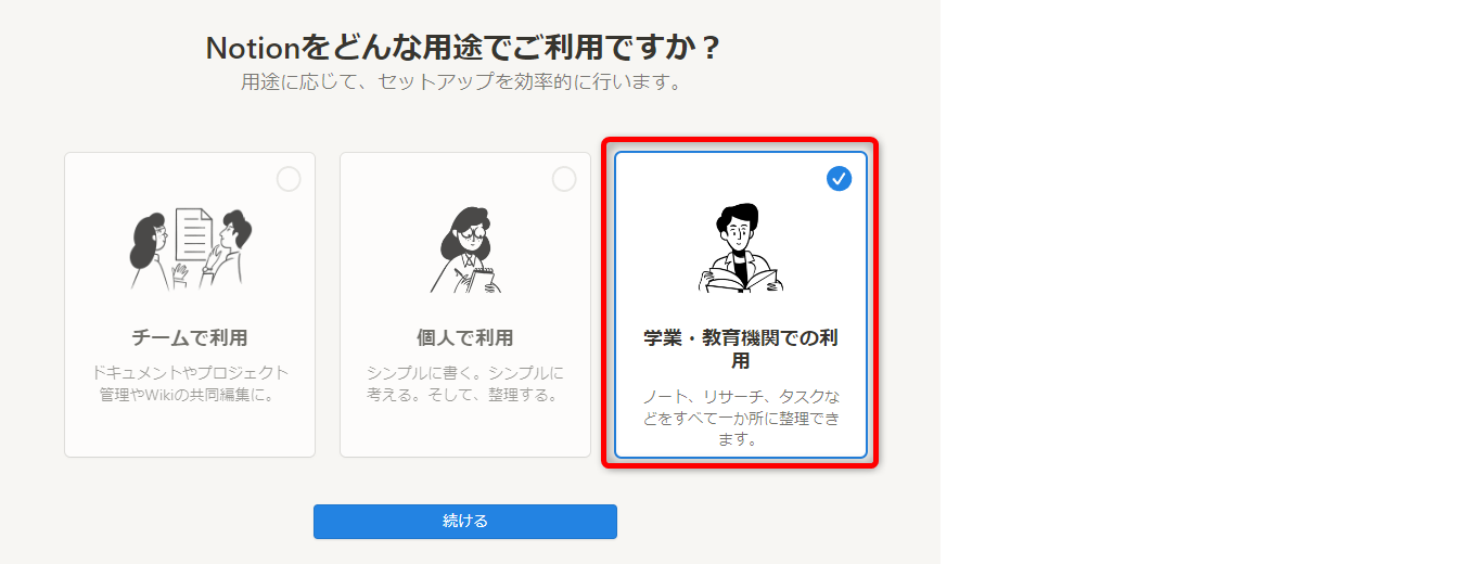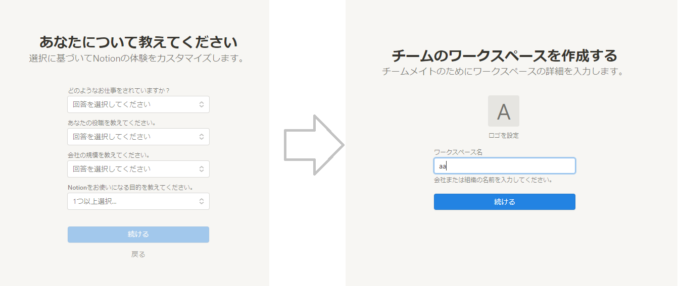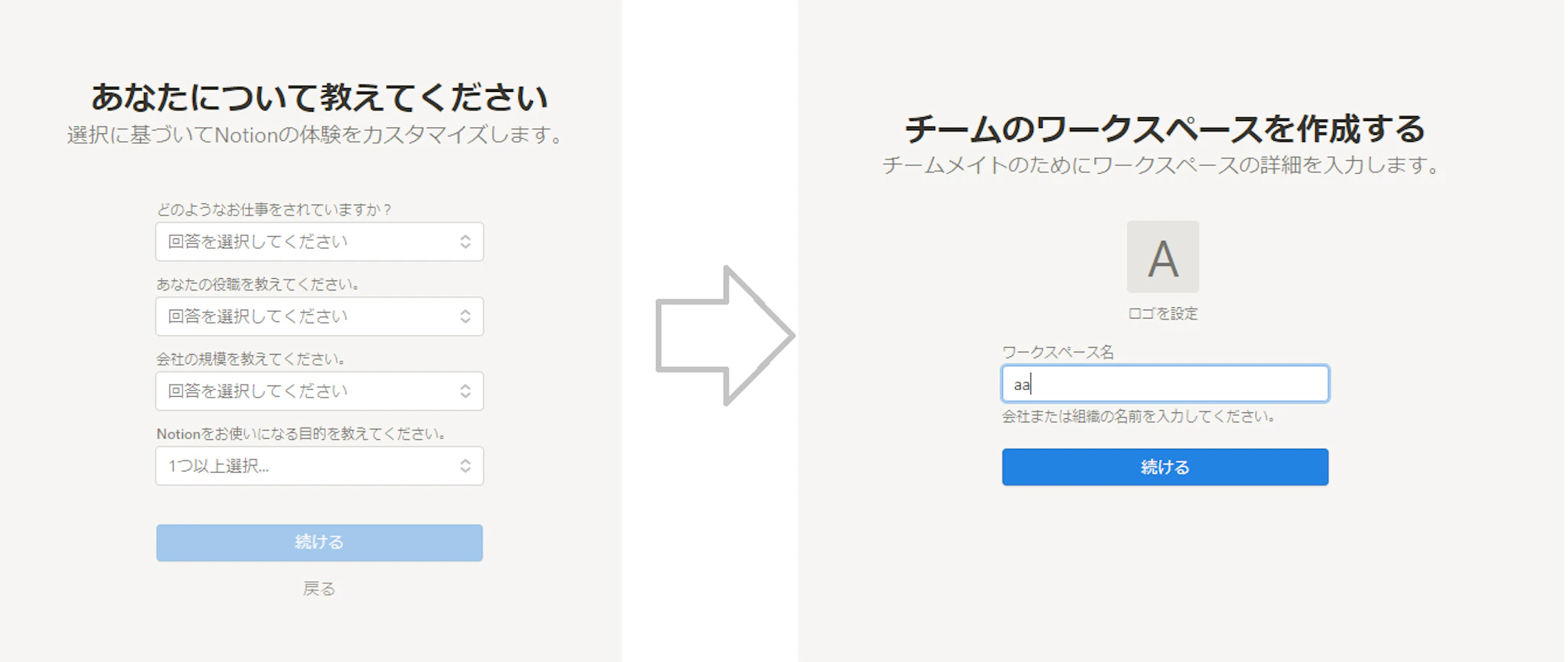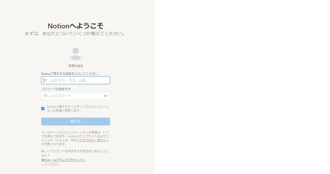 Notionで使う名前など必要事項を入力し、[続ける]を押します。