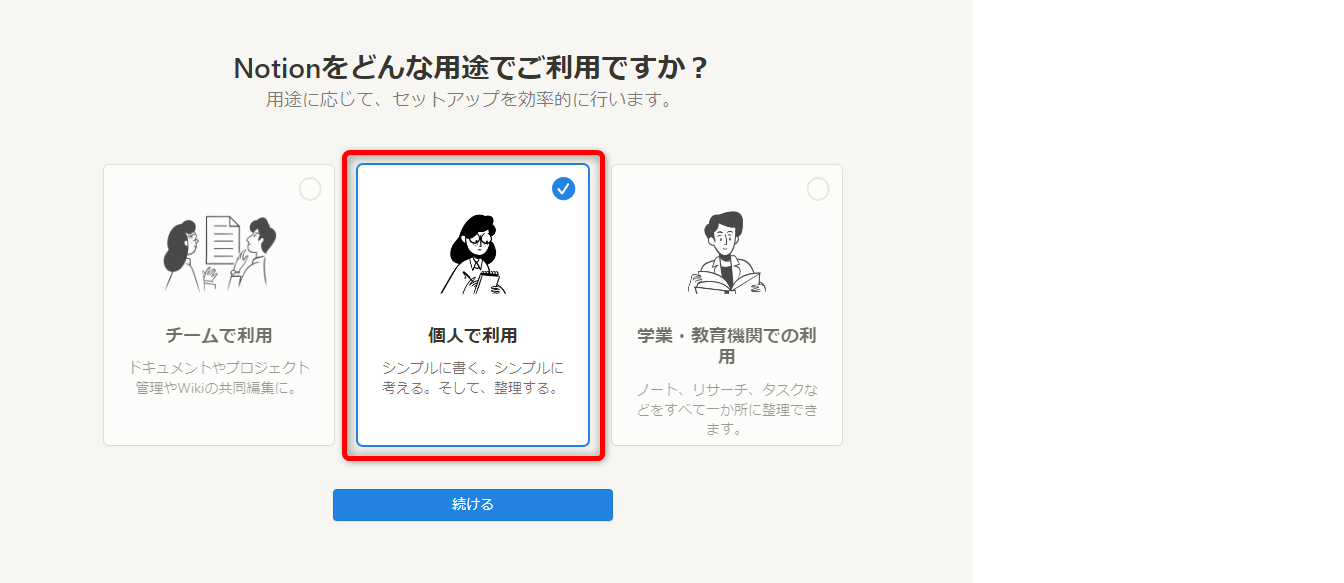 [個人で利用]にチェックを入れ、[続ける]をクリックするとNotionが開きます。