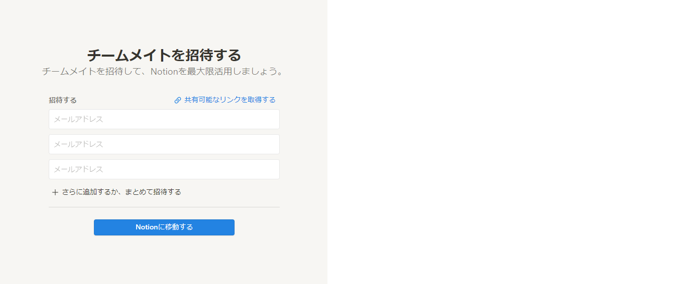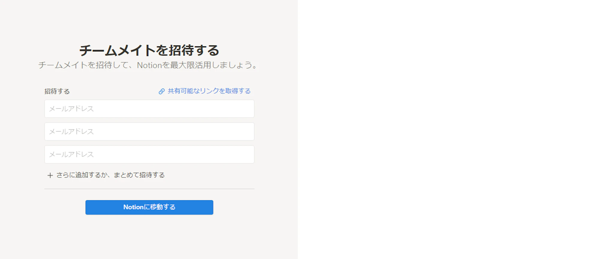 フリープラン(チーム利用)でNotionアカウントを取得します。アカウントの取得方法は、「フリー(チーム)申し込み方法」をご参照ください。