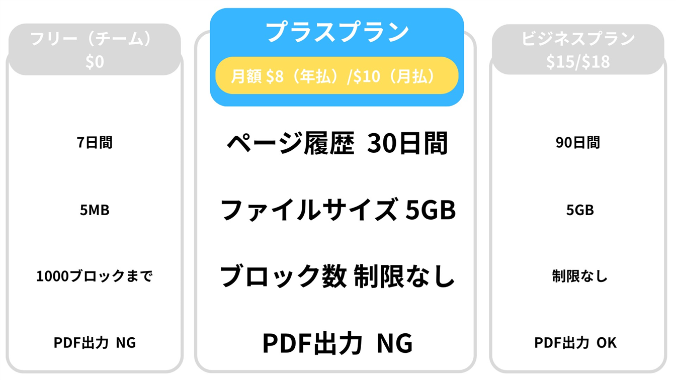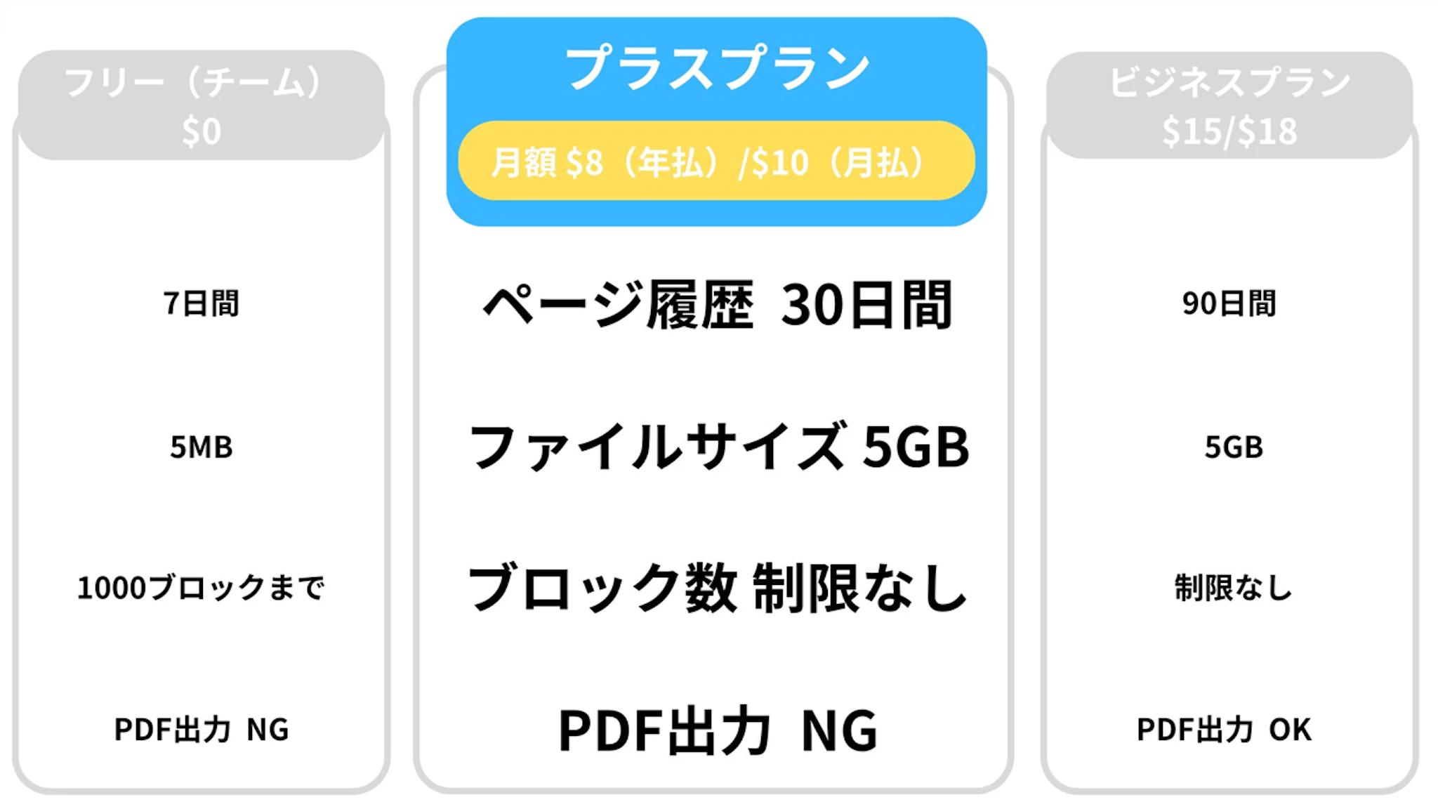 Notionを個人で利用する方には、フリープランまたは、プラスプランがおすすめです。