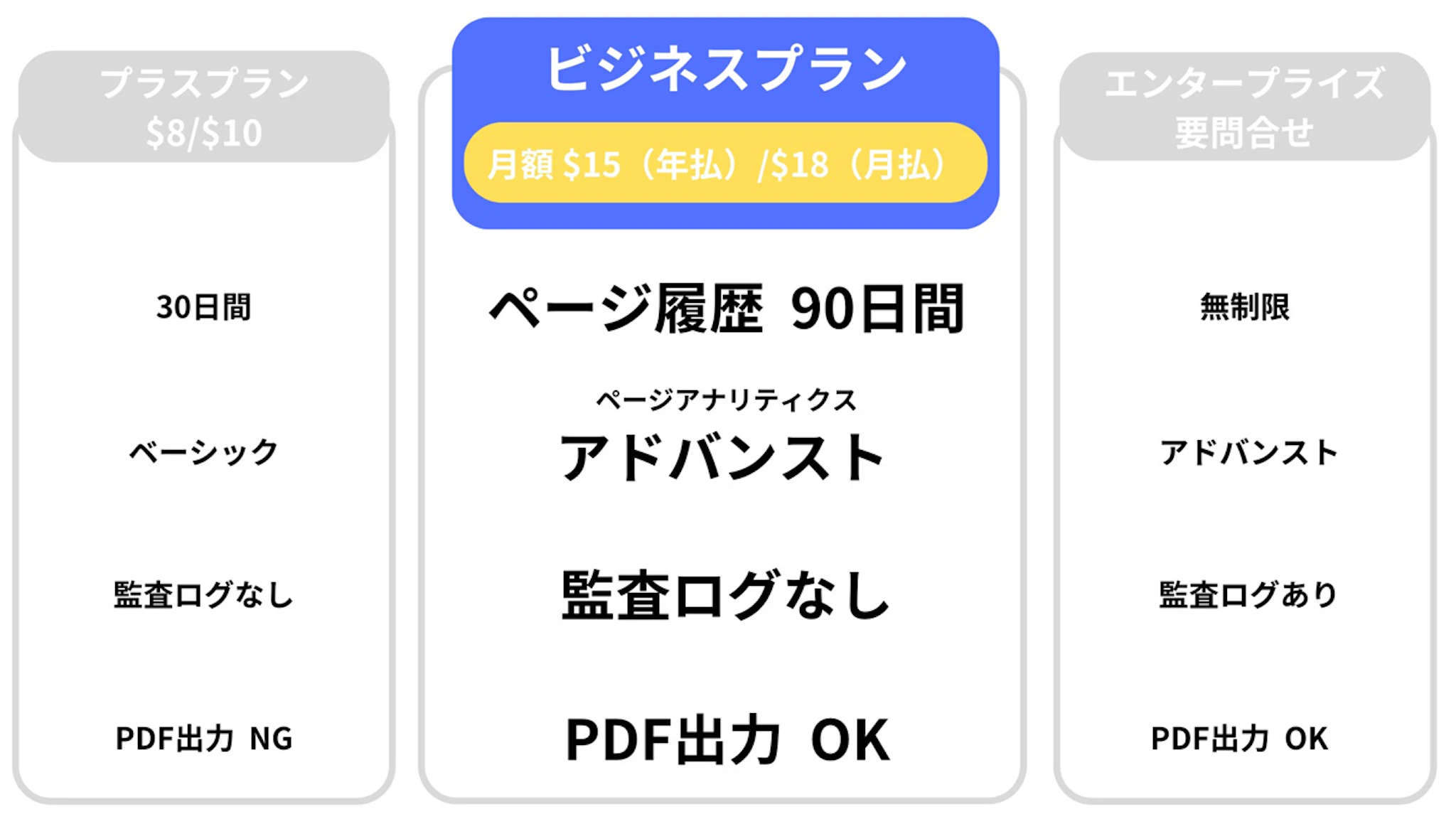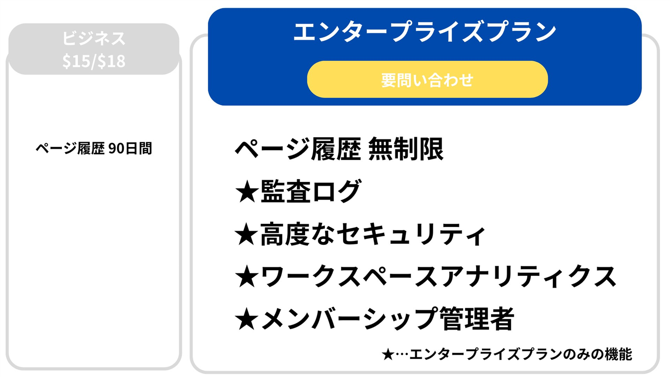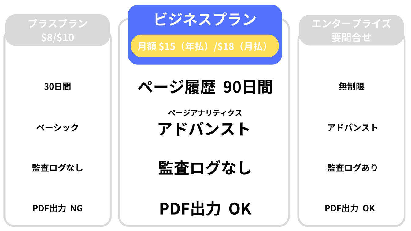 ビジネスプランかエンタープライズプランか迷っている場合は、監査ログや高度なアクセス権設定などの管理機能が必要かどうかで検討すると良いでしょう。