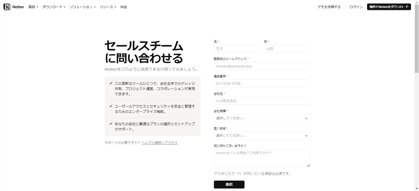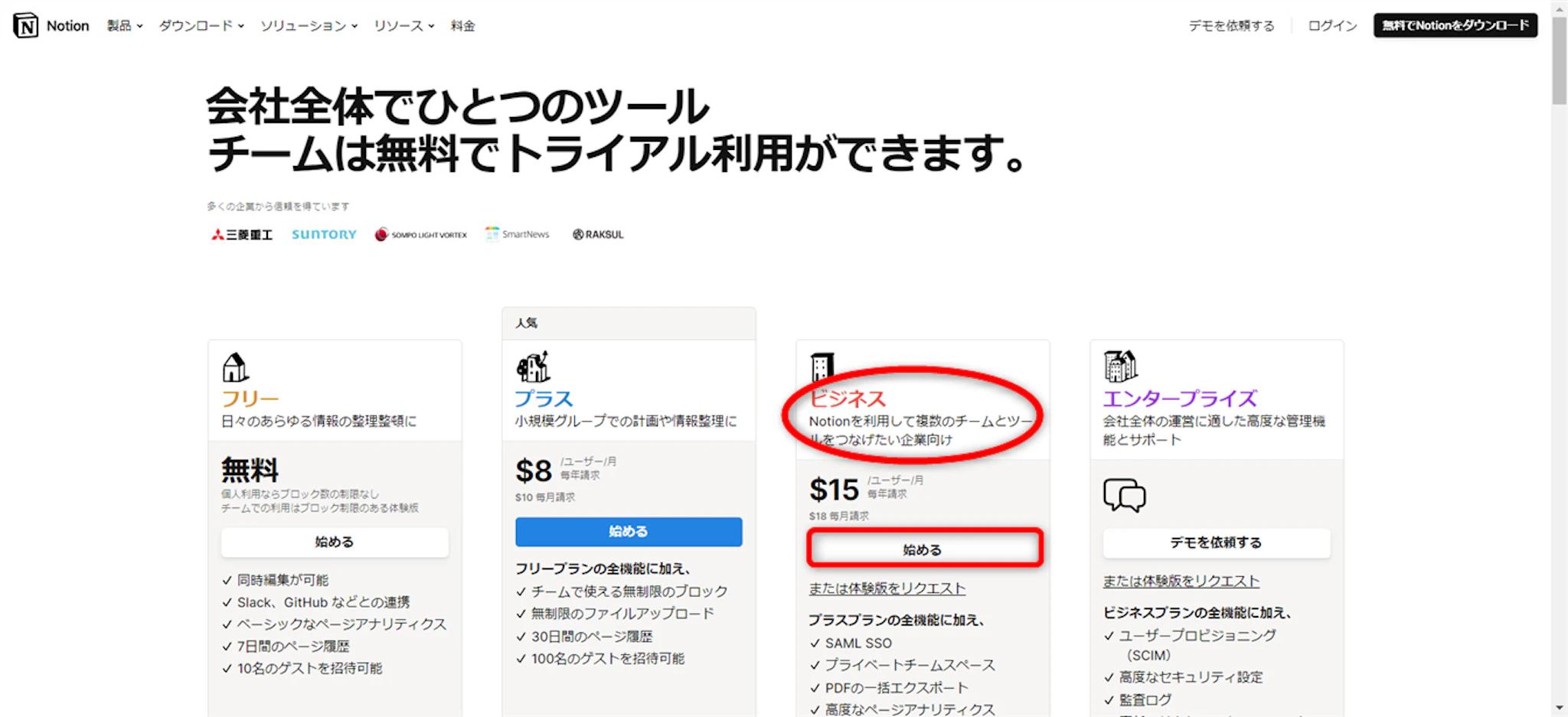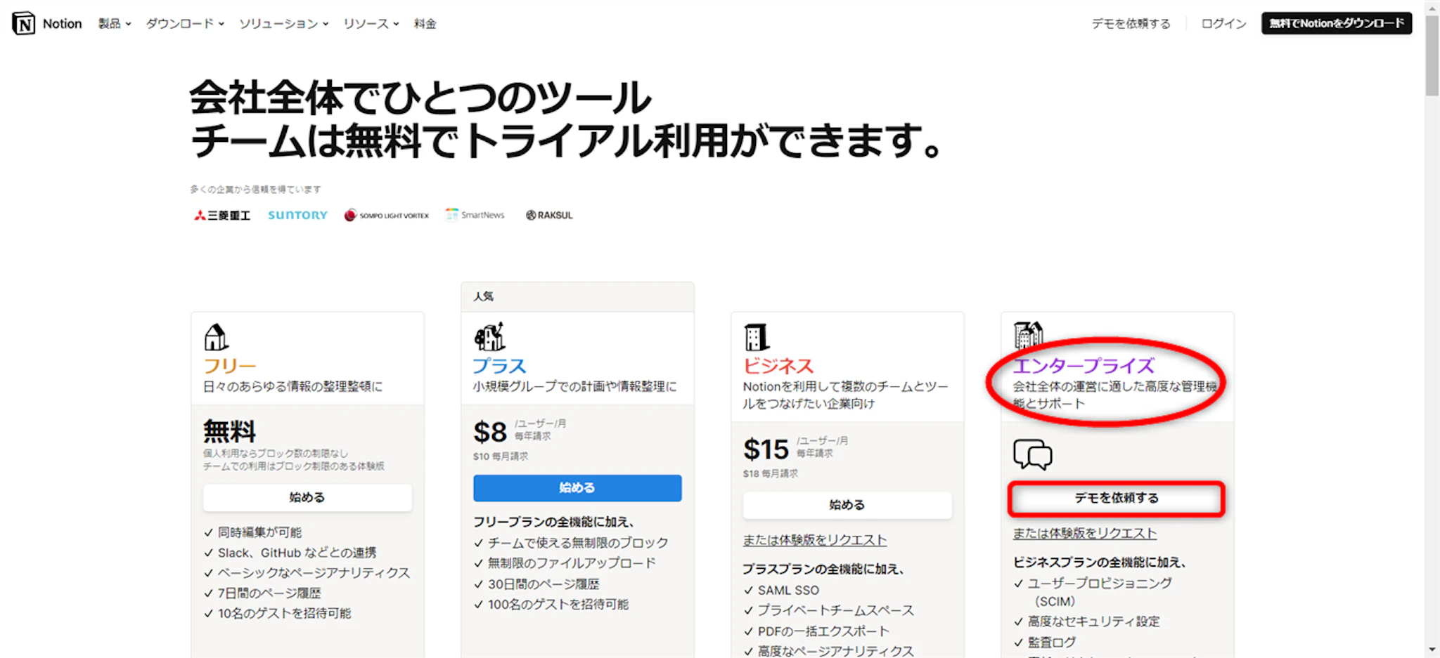 Notionの価格表ページから[デモを依頼する]をクリックして開きます。