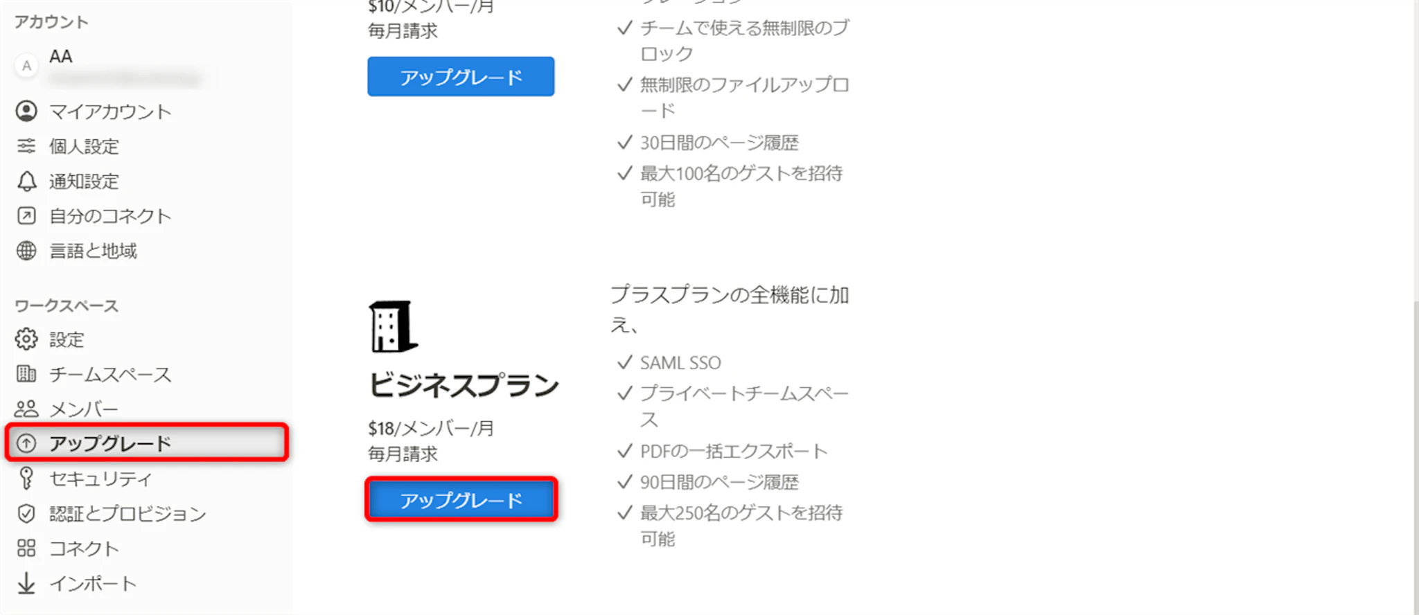 設定画面のサイドバーから[アップグレード]をクリックします。