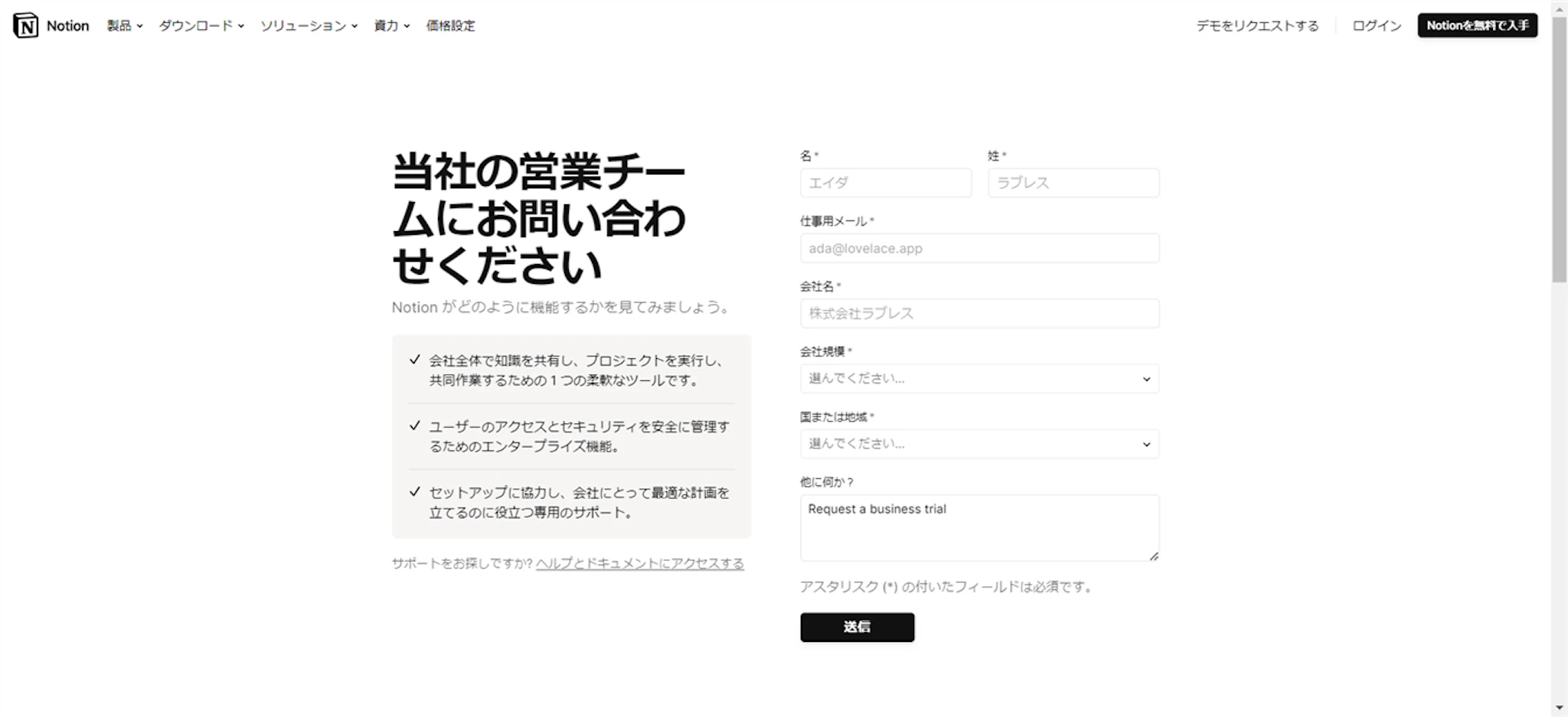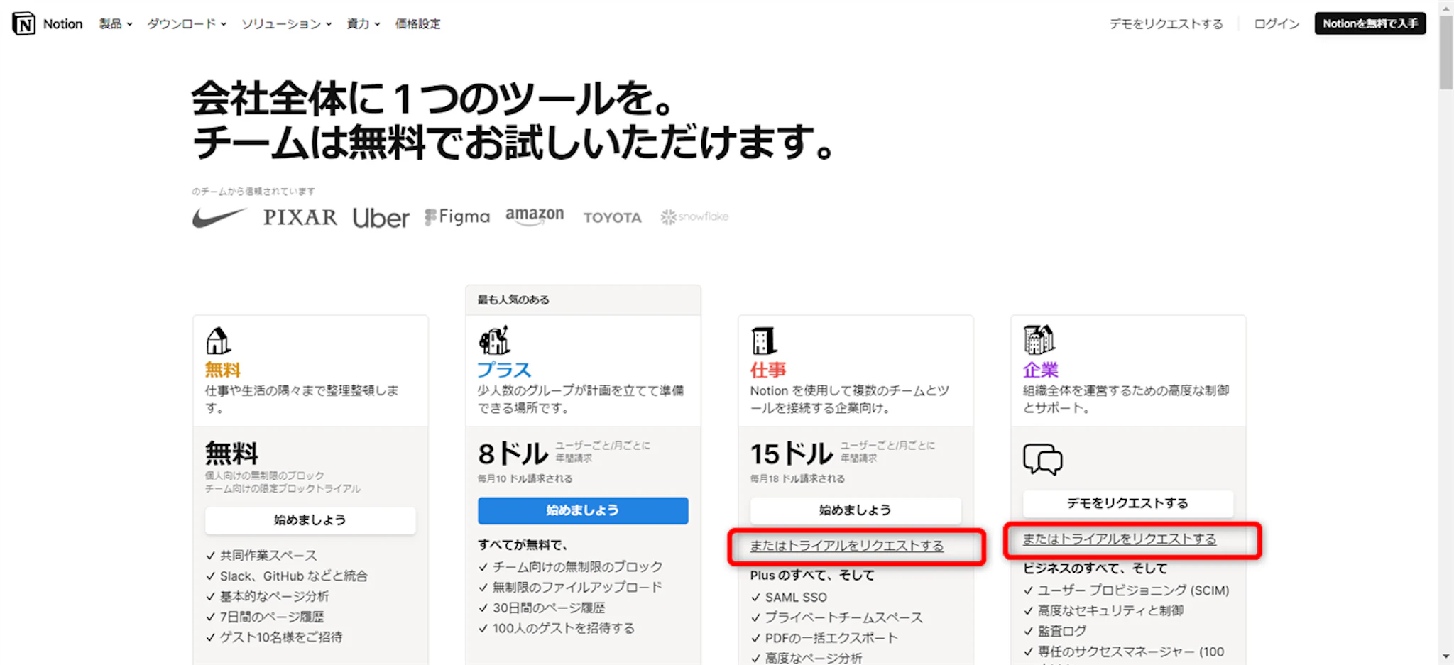 ビジネスプラン、エンタープライズプランは、Notionセールスチームにトライアルを依頼しましょう。