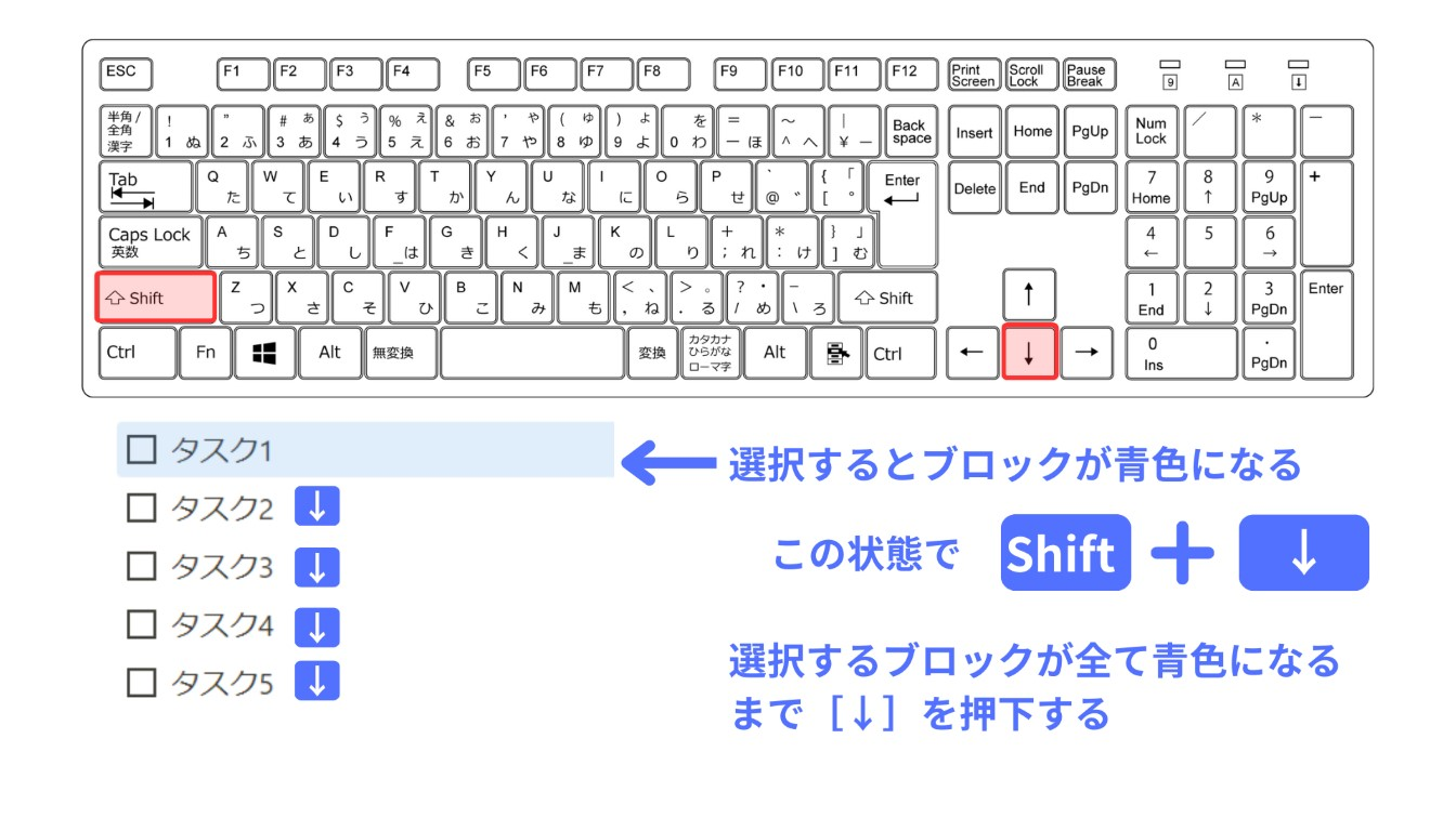 | ブロックを複数選択する | Shift + ↑↓