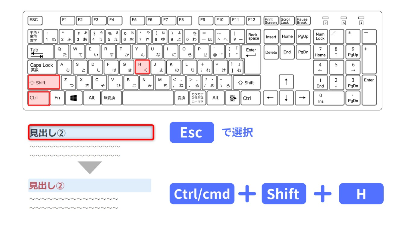 | 直前に使った文字色や背景色を適用 | [Ctrl/cmd]+[Shift]+[H] |