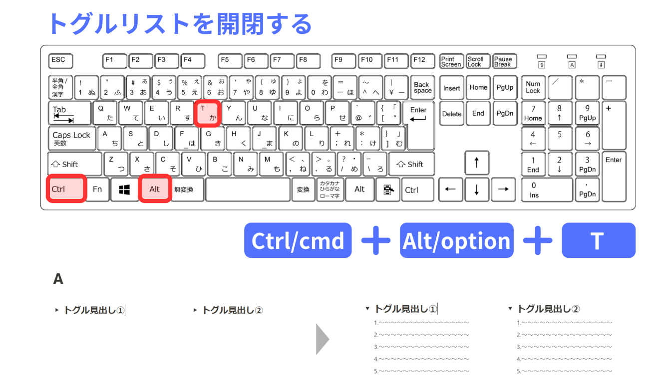 トグルリストを開閉するショートカットを使うと、このページ内に設置されているトグルリストをまとめて一度に開閉できます。
