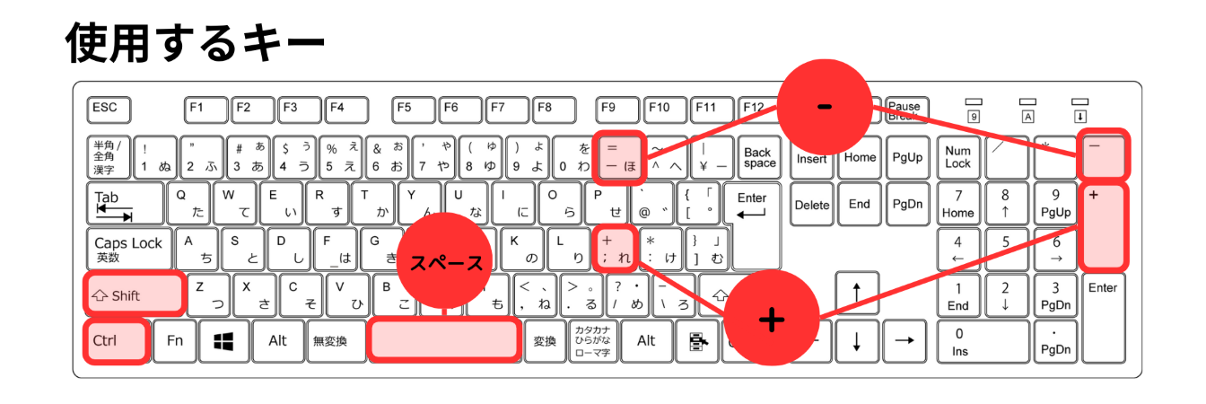| 画面のズームイン | Ctrl + +(プラス) | cmd + +(プラス) |