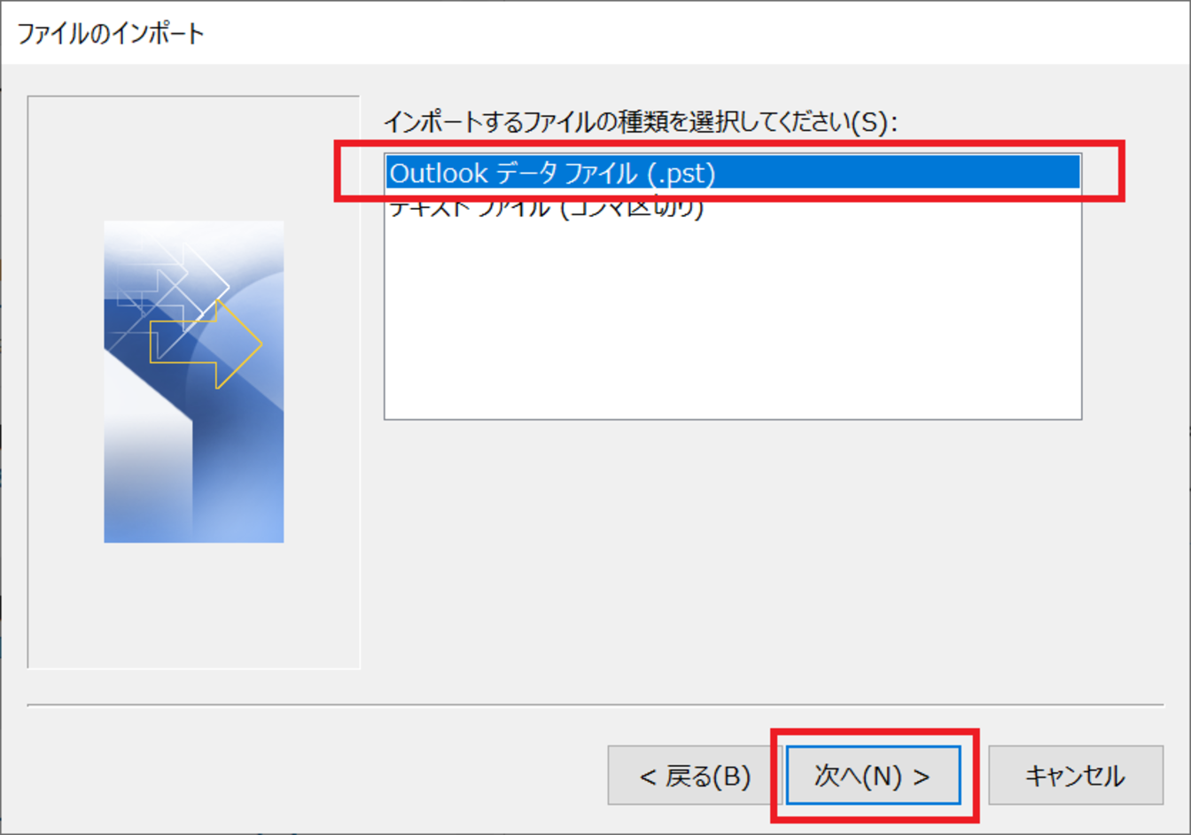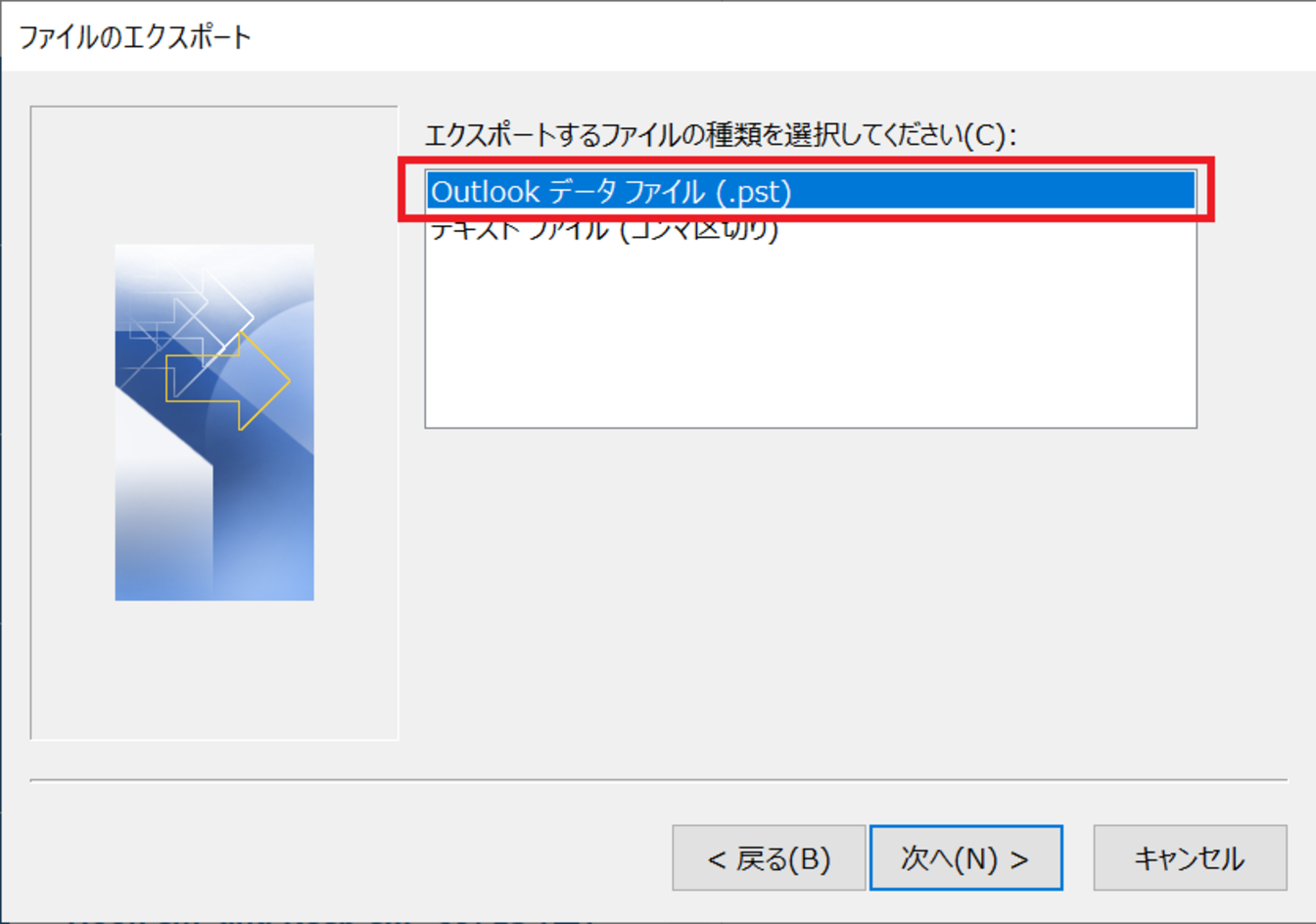 [Outlook データファイル(.pst)]を選択し、[次へ]をクリックします。