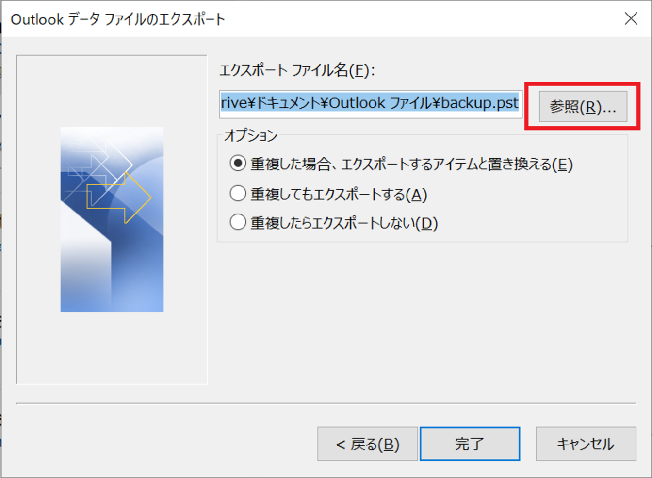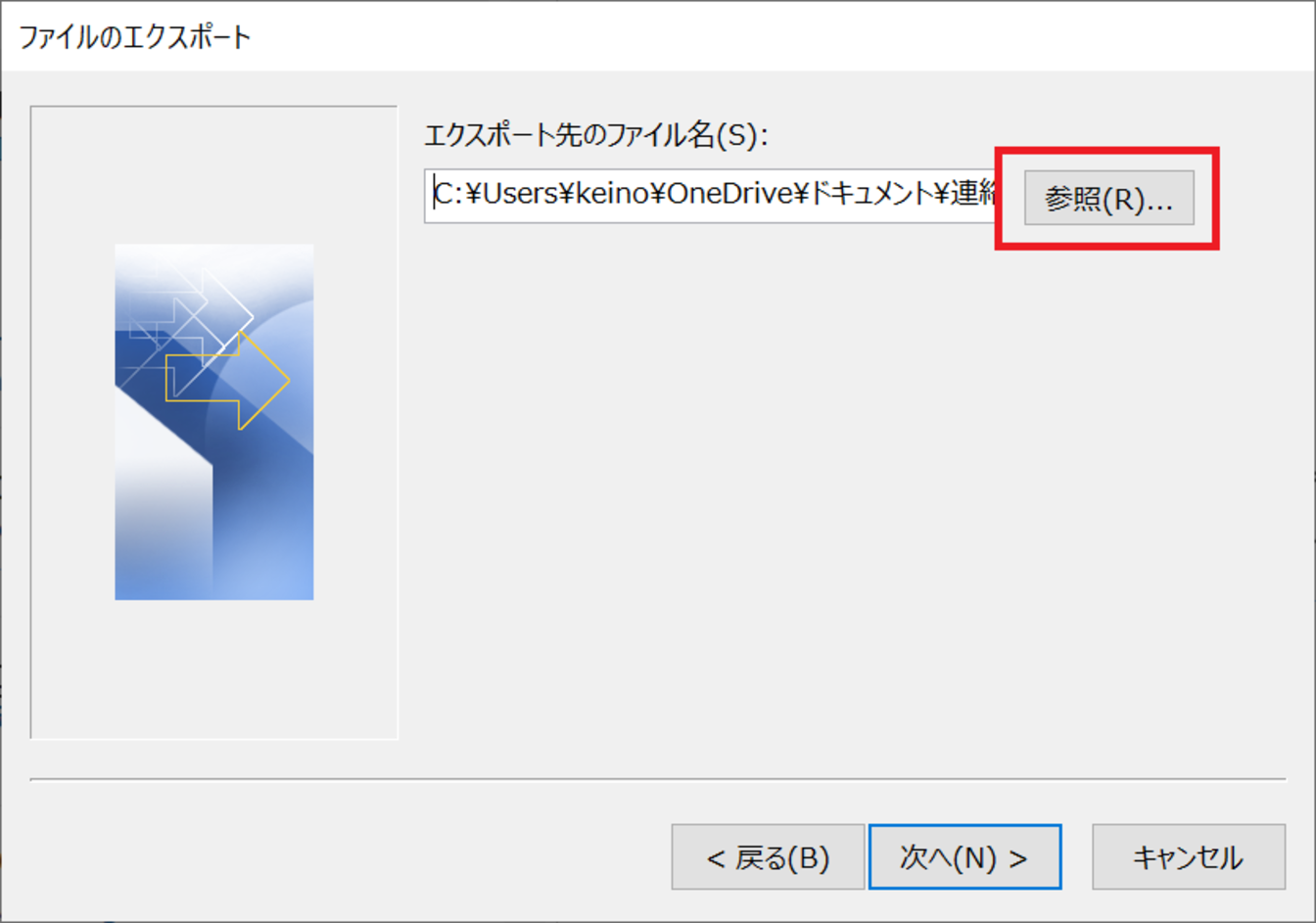保存先を決めるため、[参照]をクリックします。