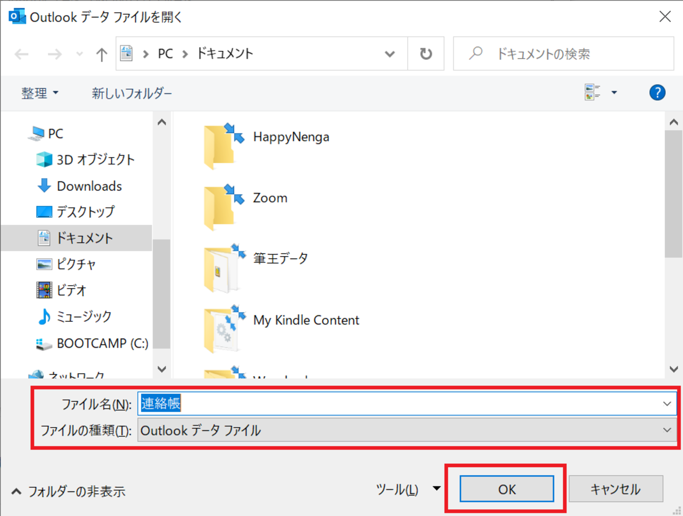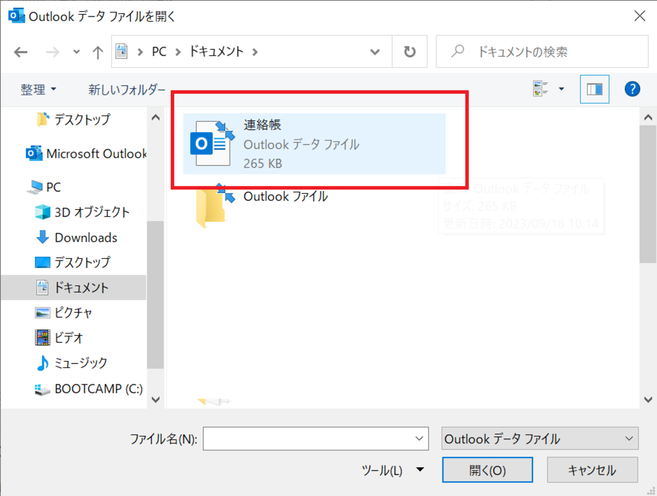 [ファイルの種類]では[Outlook データ ファイル]を選択し、[OK]をクリックします。