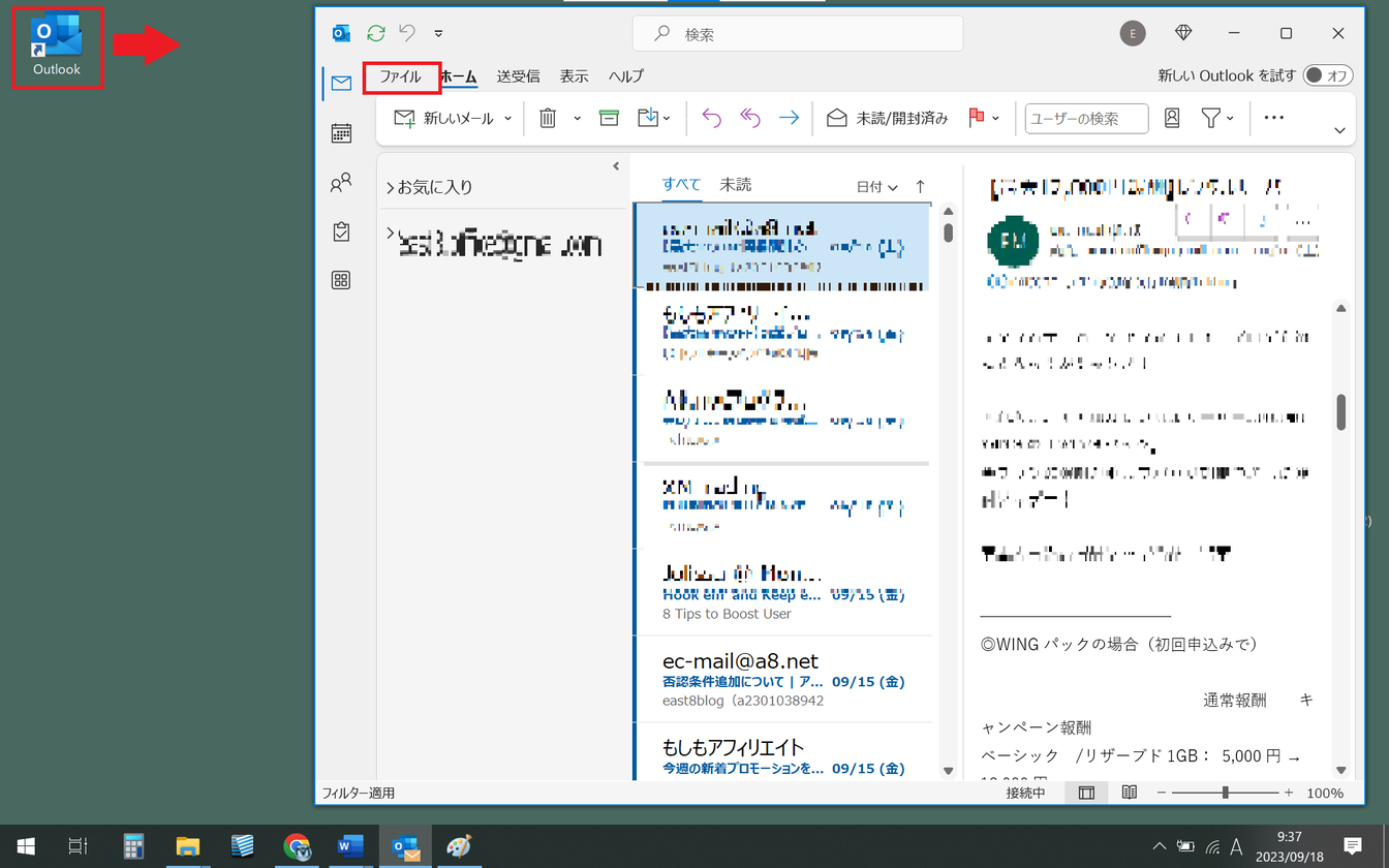 Outlookを起動し、ウィンドウ上部の[ファイル]をクリックします。