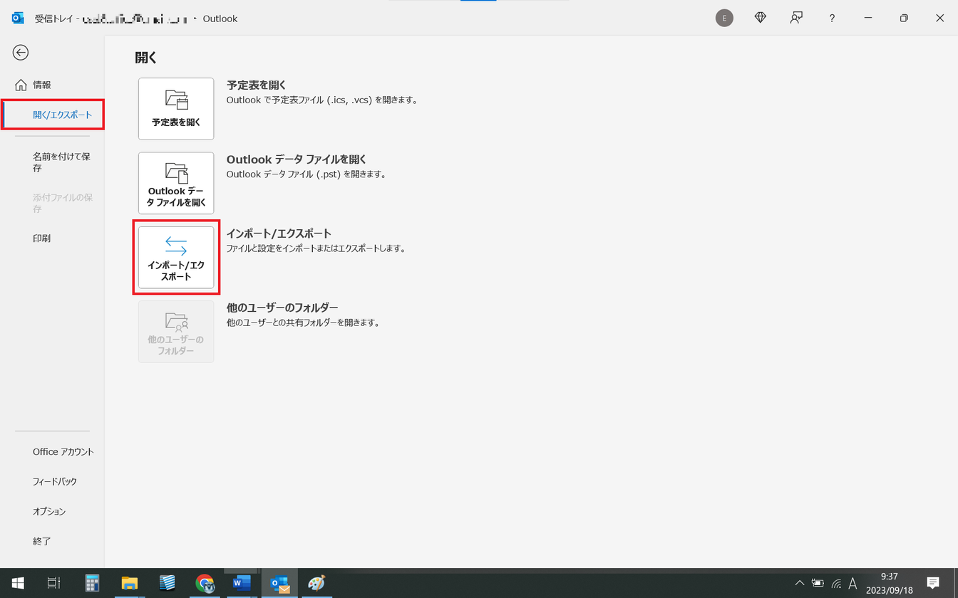 左メニューの[開く/エクスポート]を選択し、右メニューの[インポート/エクスポート]をクリックします。