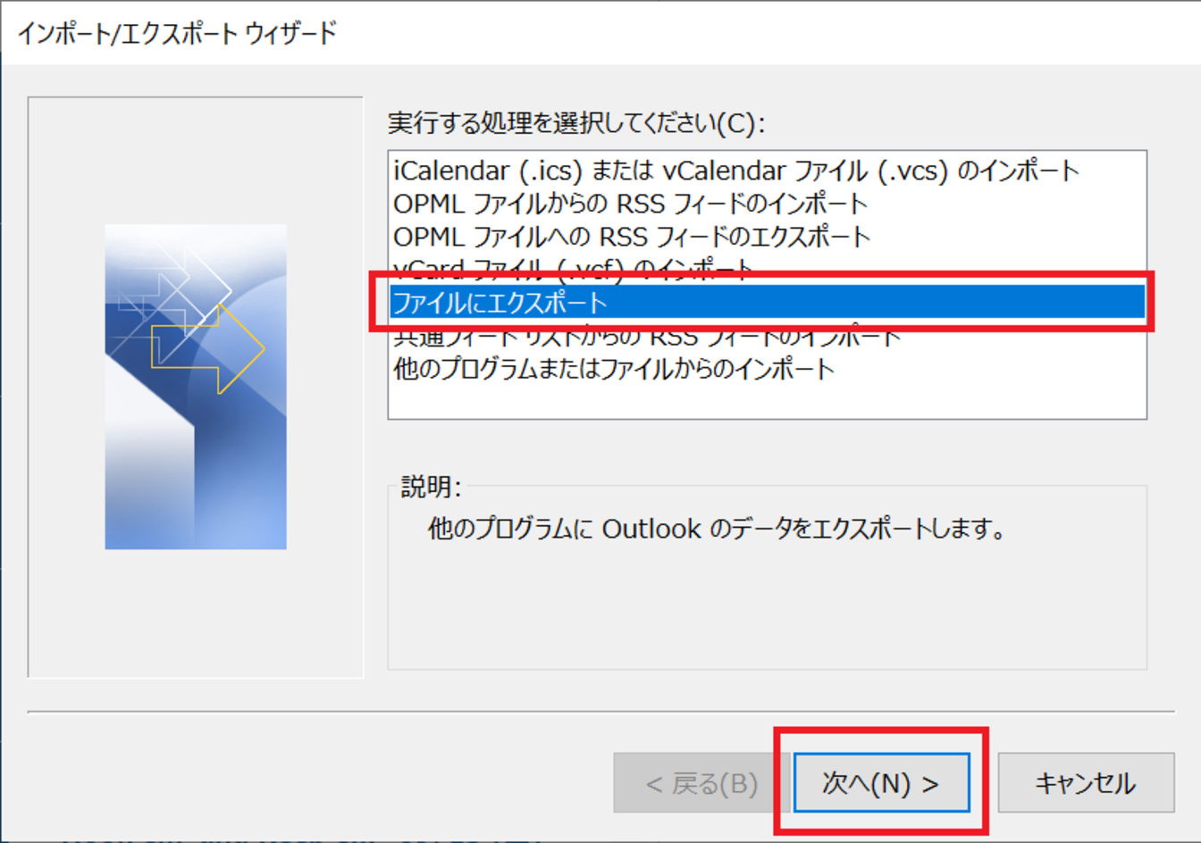 [ファイルにエクスポート]を選択し、[次へ]をクリックします。