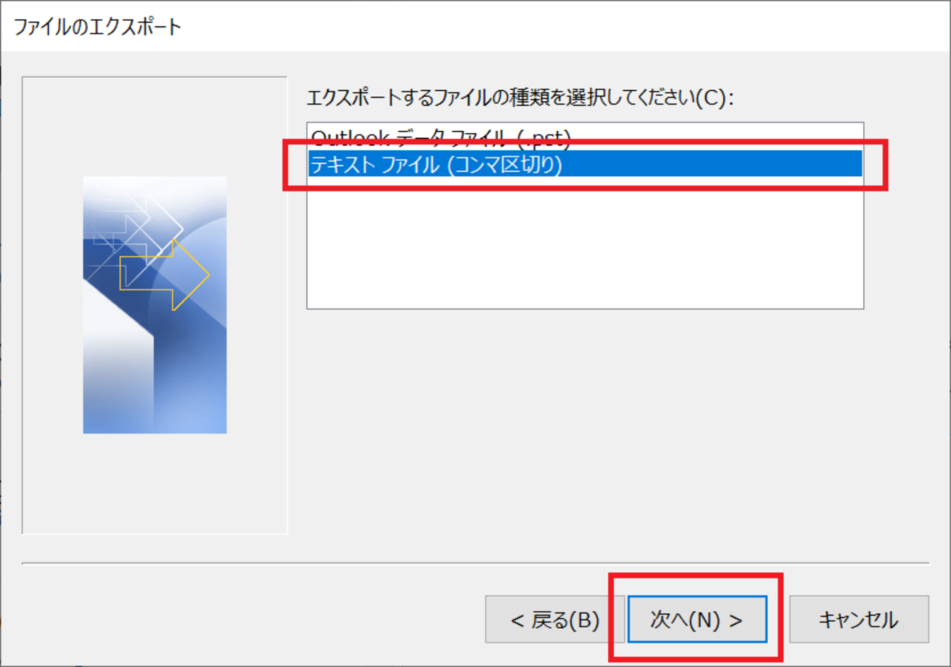 [テキストファイル(コンマ区切り)]をクリックし、[次へ]をクリックします。