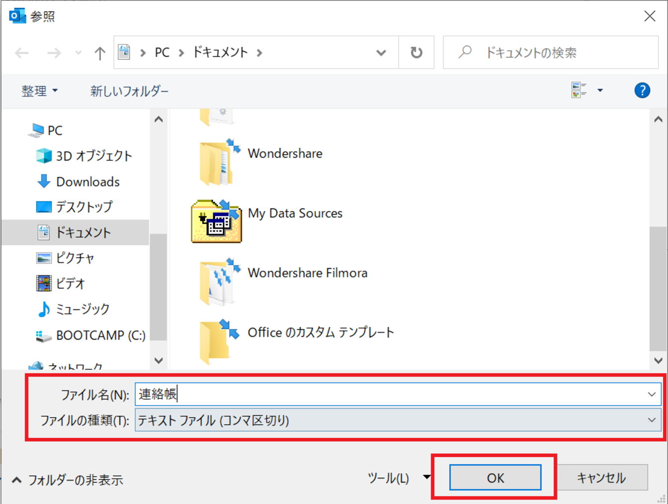 [ファイルの種類]は[テキストファイル(コンマ区切り)(.CSV)]を選択し、[OK]をクリックします。