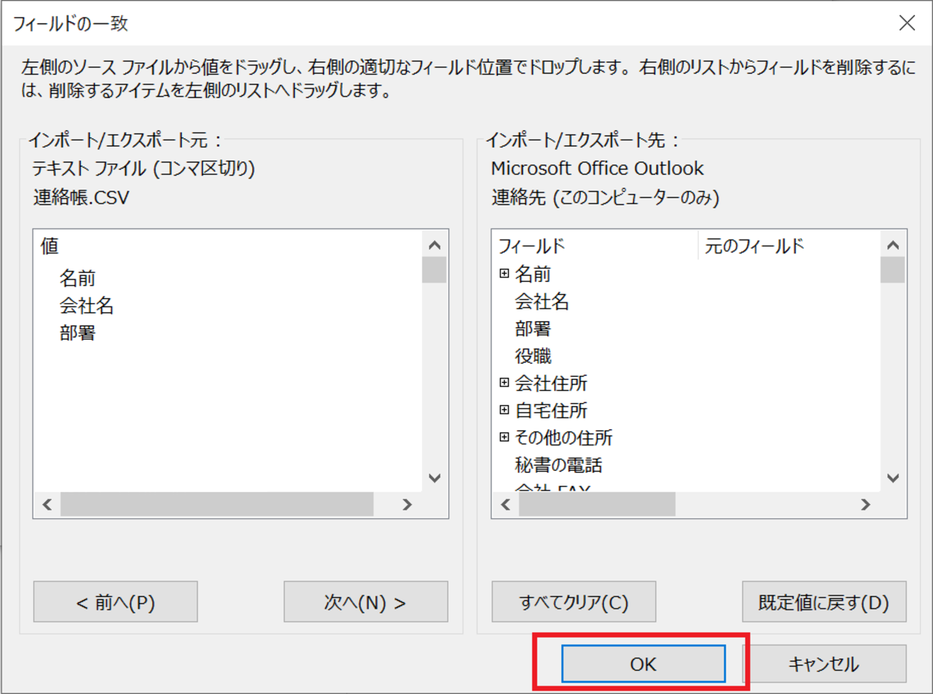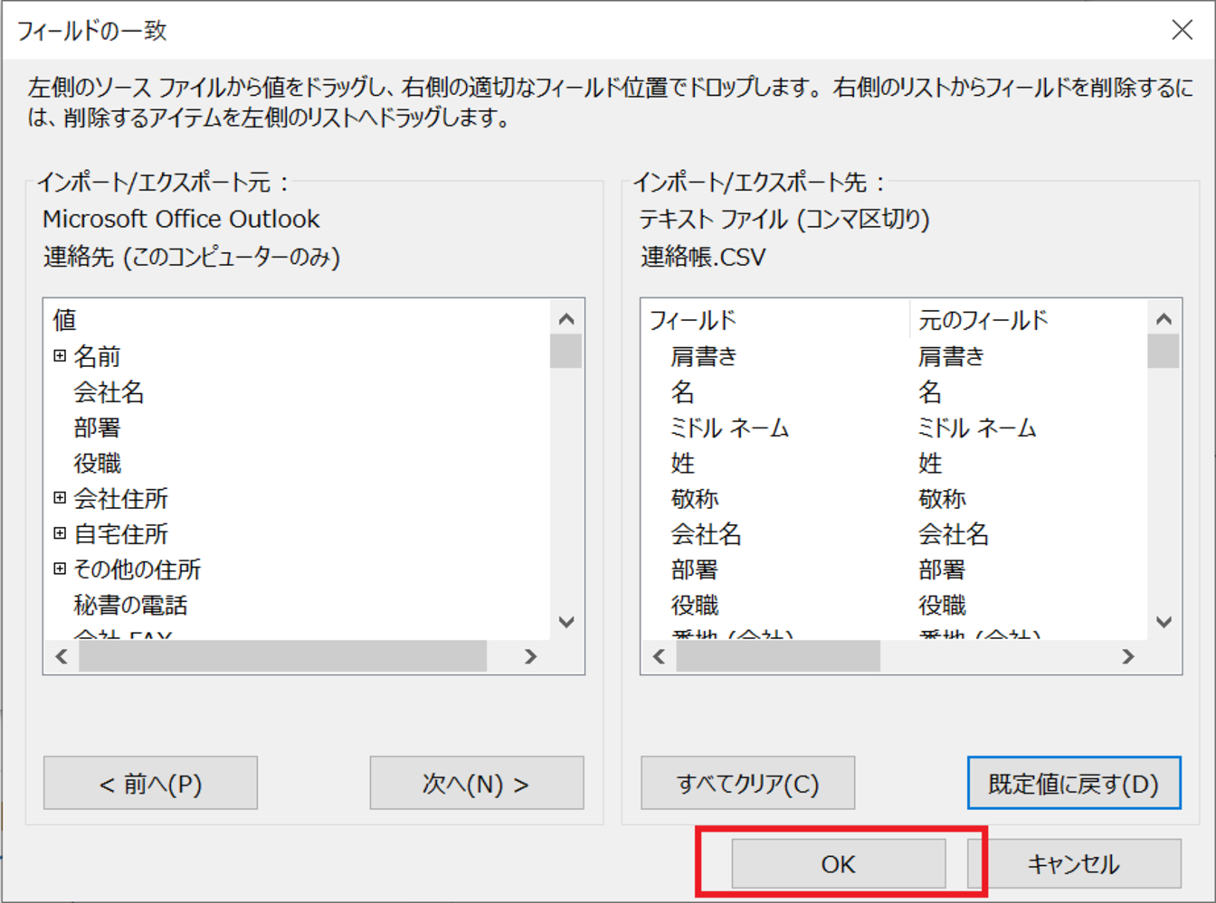 [インポート/エクスポート元]の[連絡先]と[インポート/エクスポート先]の[連絡帳]のフィールドを一致させ、[OK]をクリックします。