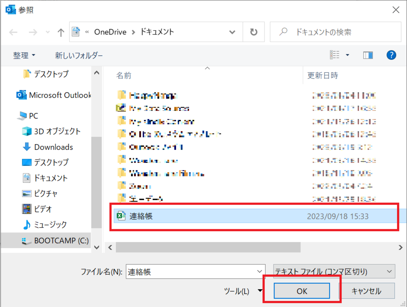 例)[ドキュメント]のフォルダーから、[連絡帳.CSV]ファイルを選択。