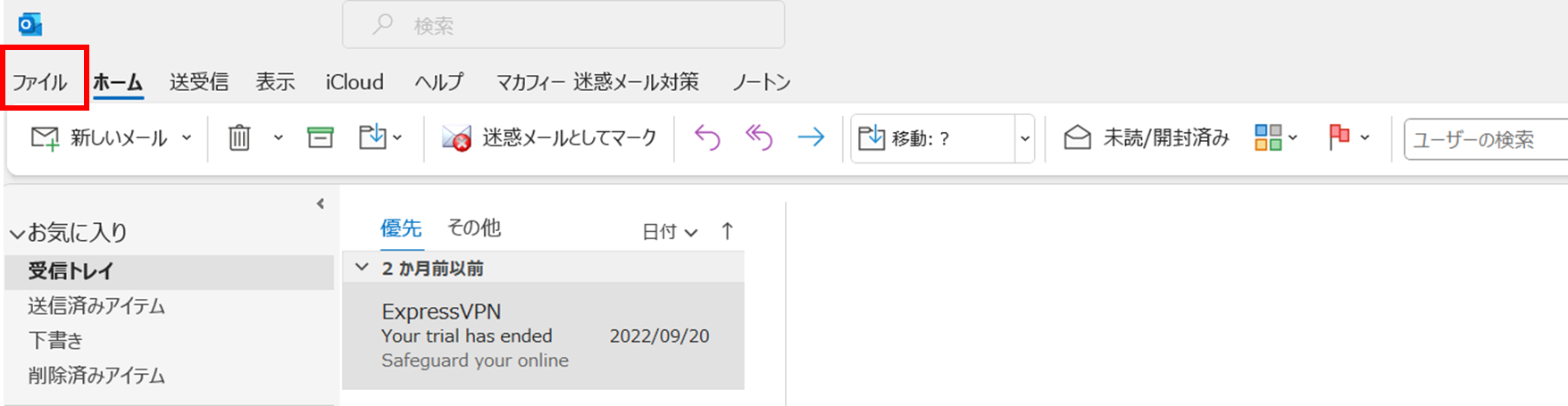 従来バージョンのOutlookアプリを開き、画面左上の「ファイル」タブを選択します。