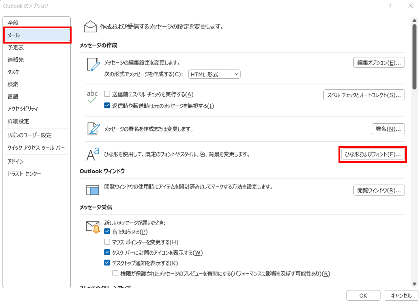 「メール」カテゴリーの中から、「ひな形およびフォント」を選択します。