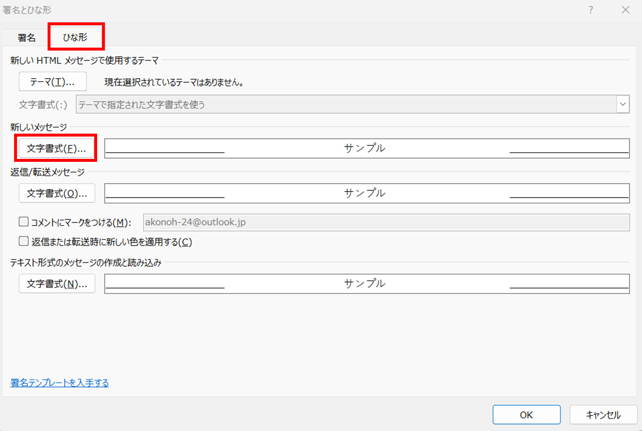 「ひな形」タブを選択します。次に「新しいメッセージ」もしくは「返信/転送メッセージ」の下にある、「文字書式」を選択します。