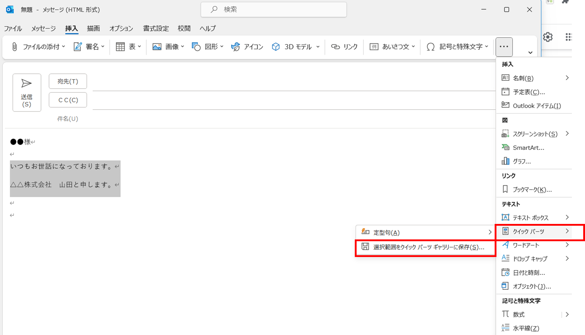 デフォルトのフォントを設定して、効率よく仕事を進めたい方におすすめの機能が、「クイックパーツ(定型文の登録)」です。