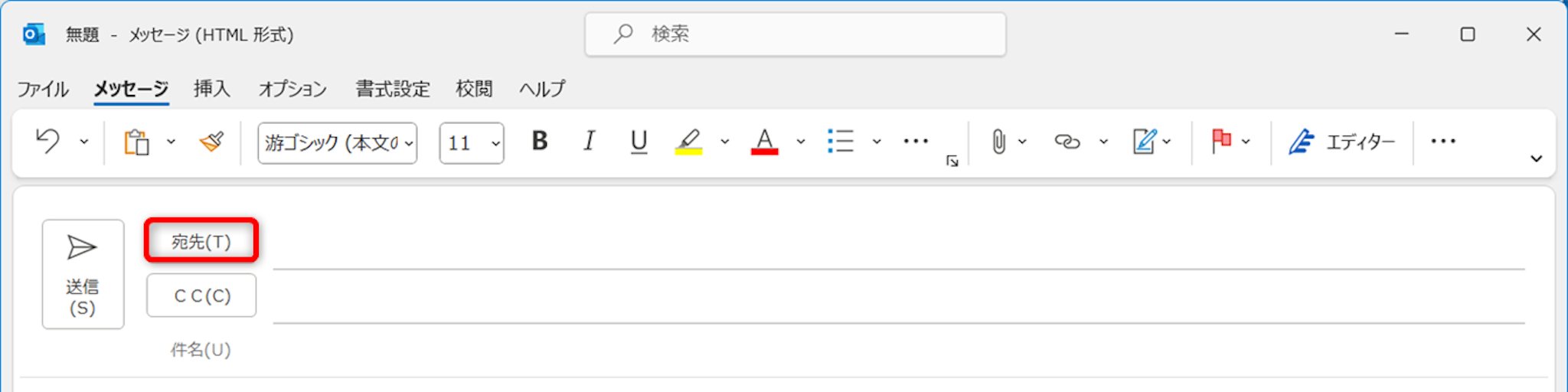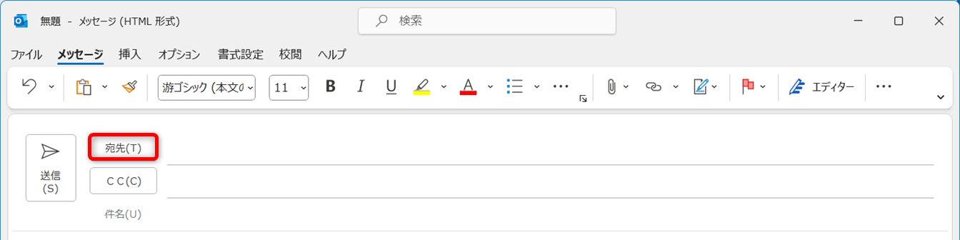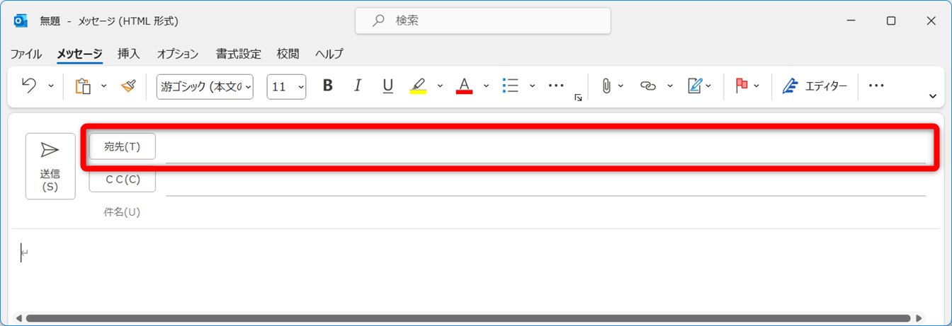 メール作成画面の[宛先]をクリックします。