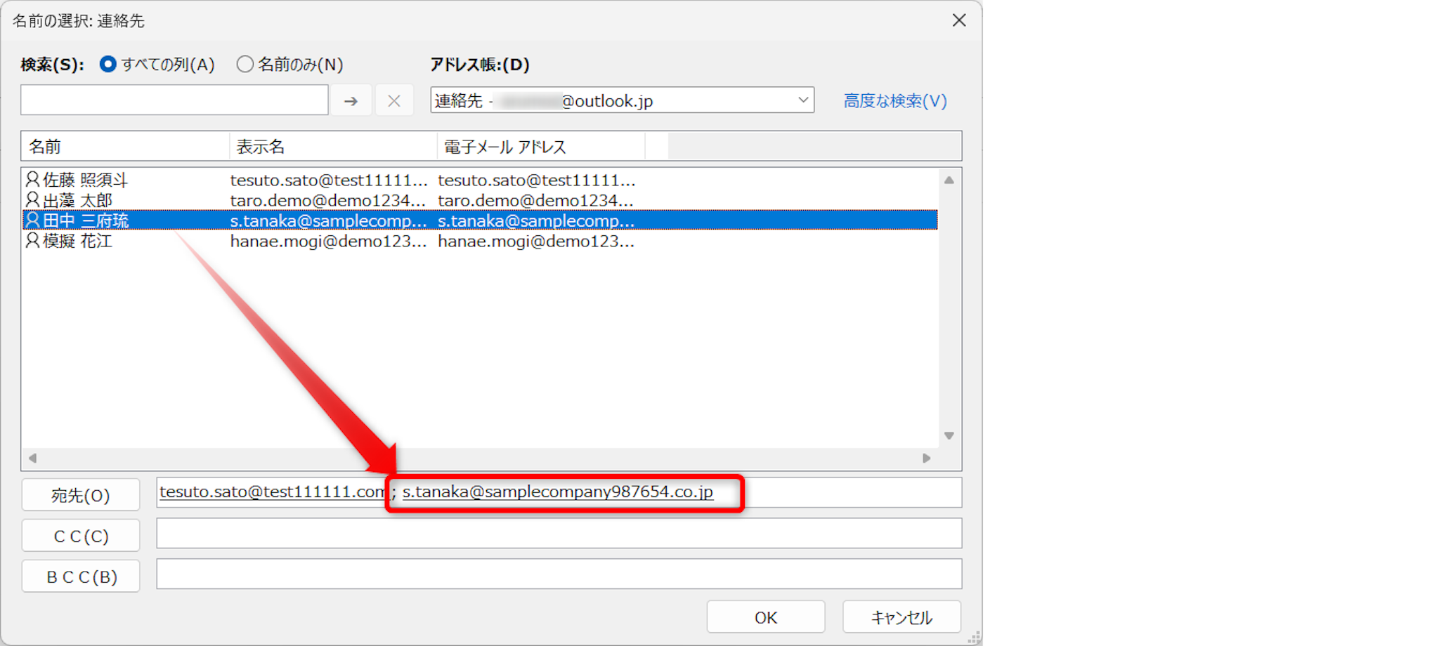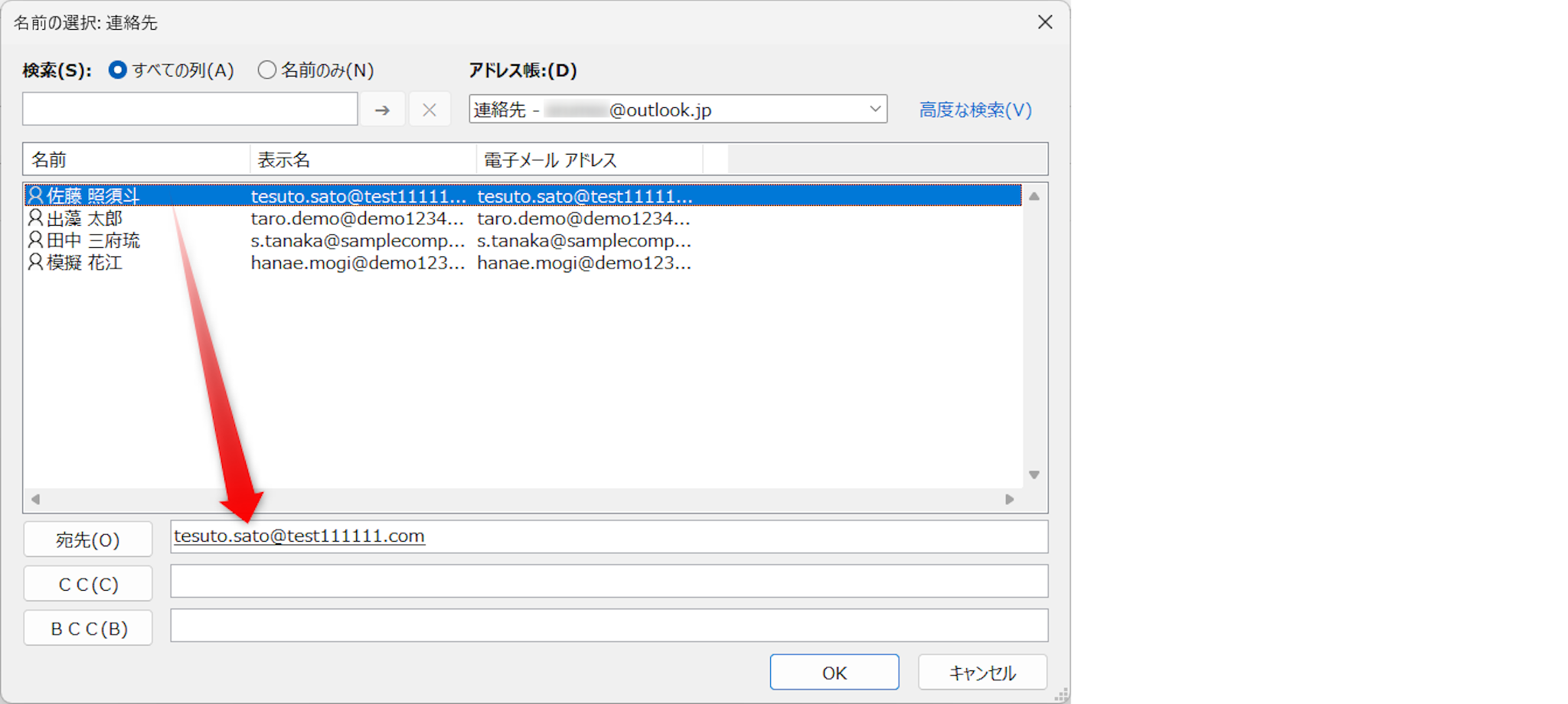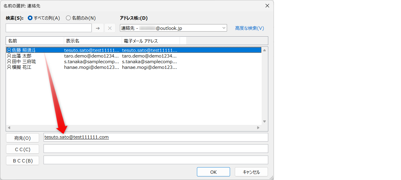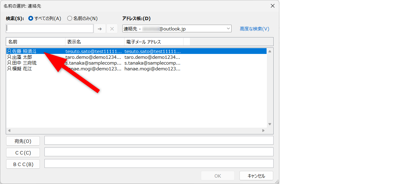 連絡帳から選択する場合は、[宛先]ボタンをクリックします。