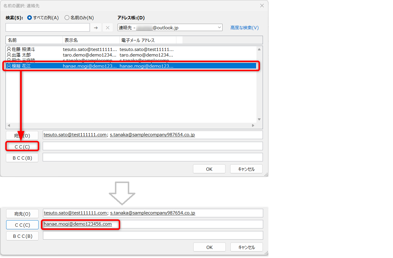 「CC」で送る場合は、連絡先をシングルクリックで選択した後、[CC]をクリックします。