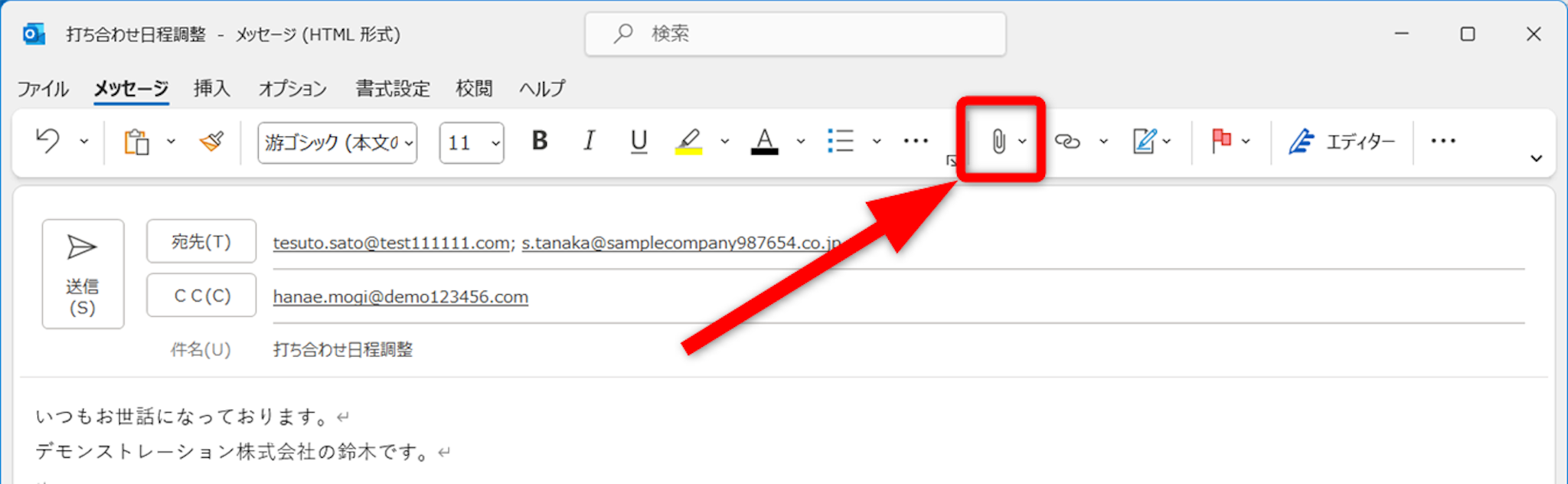 クリップのマーク[ファイルの添付]をクリックします。