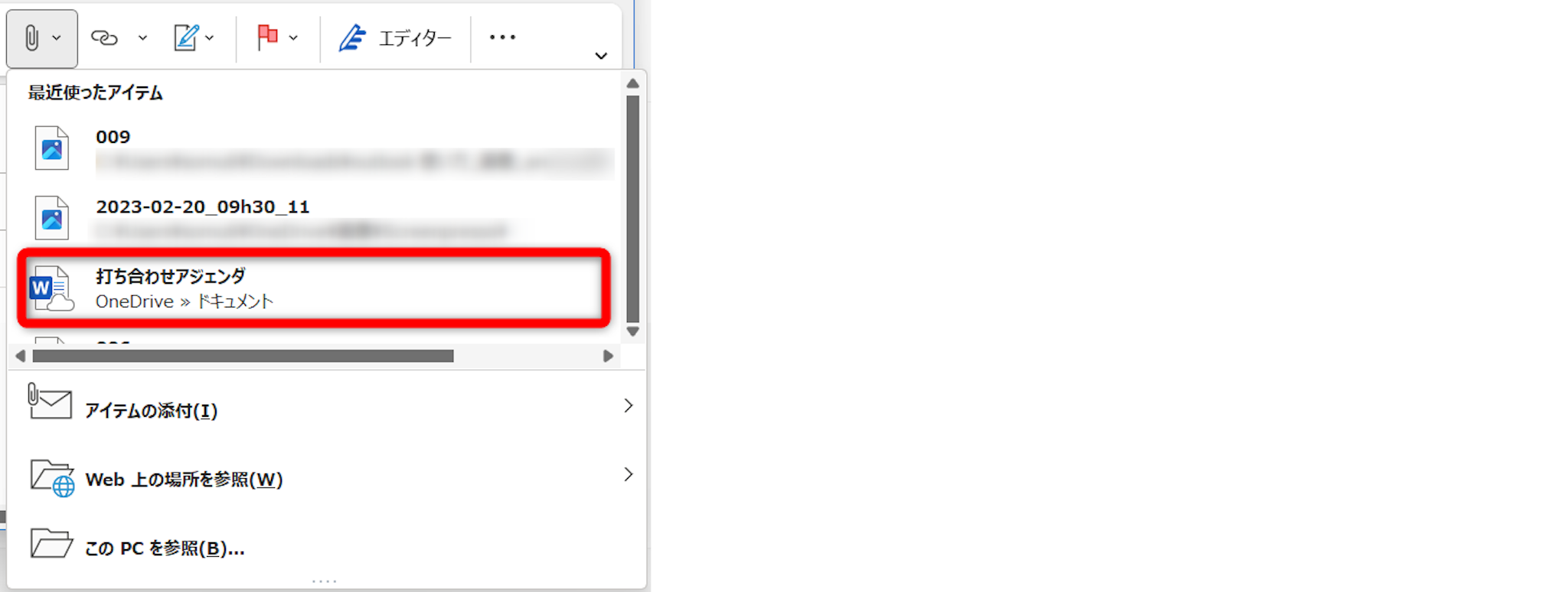 最近使ったアイテムに添付したい資料がある場合はファイル名をダブルクリックすると添付できます。