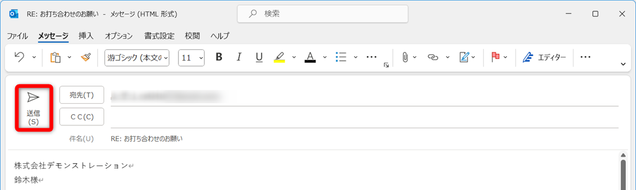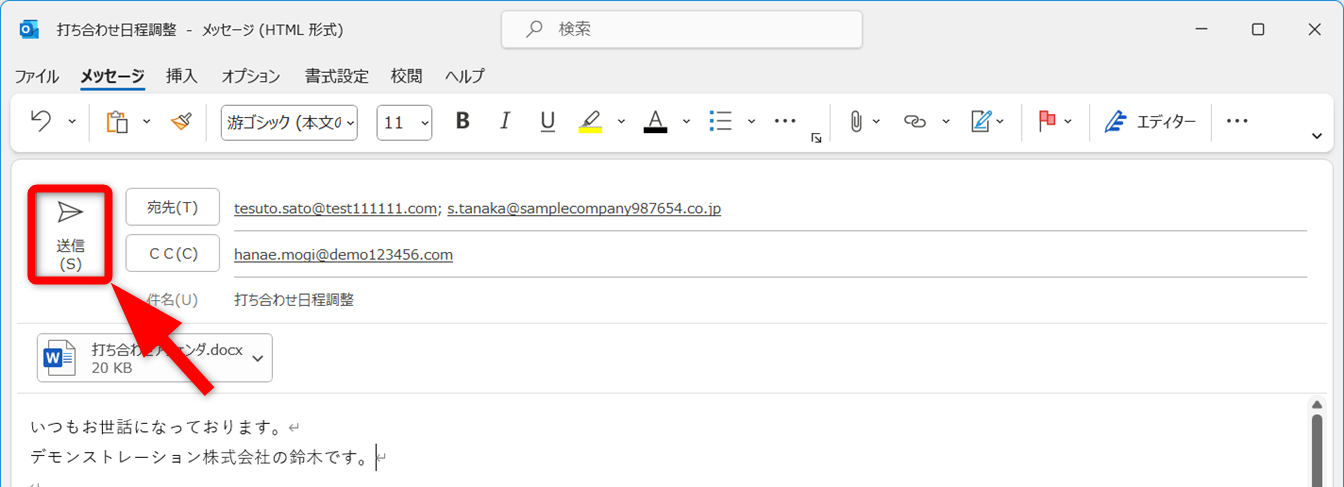 宛先、本文を追加して[送信]をクリックします。