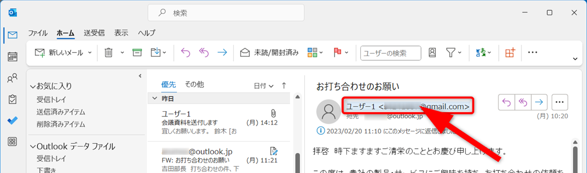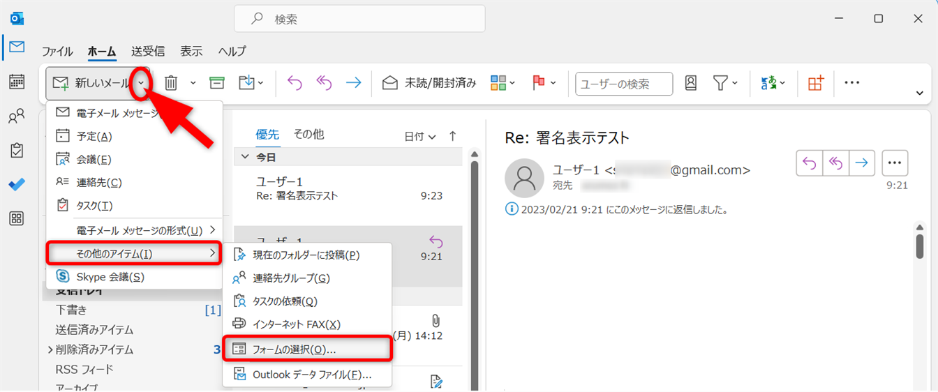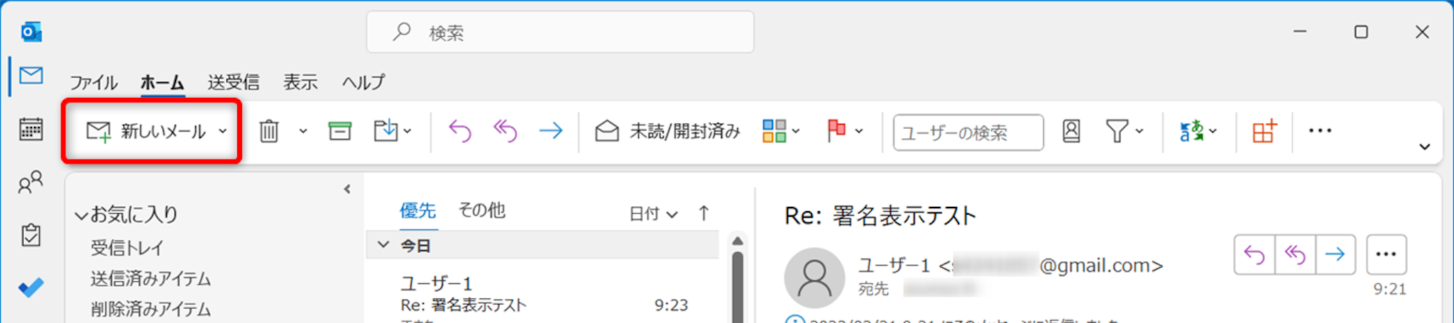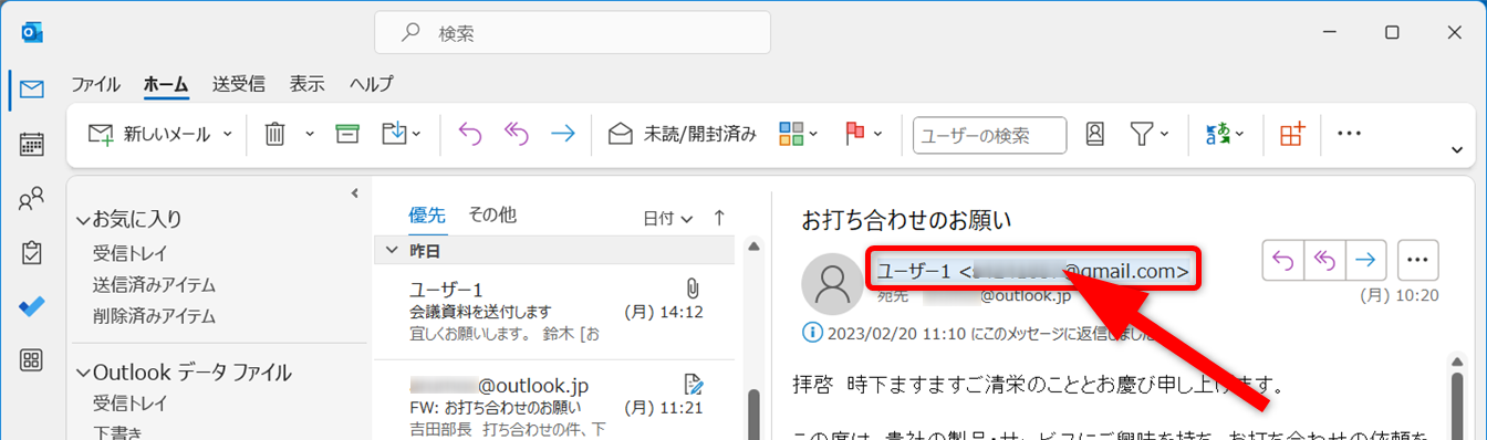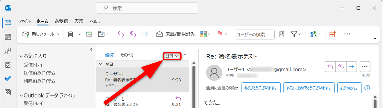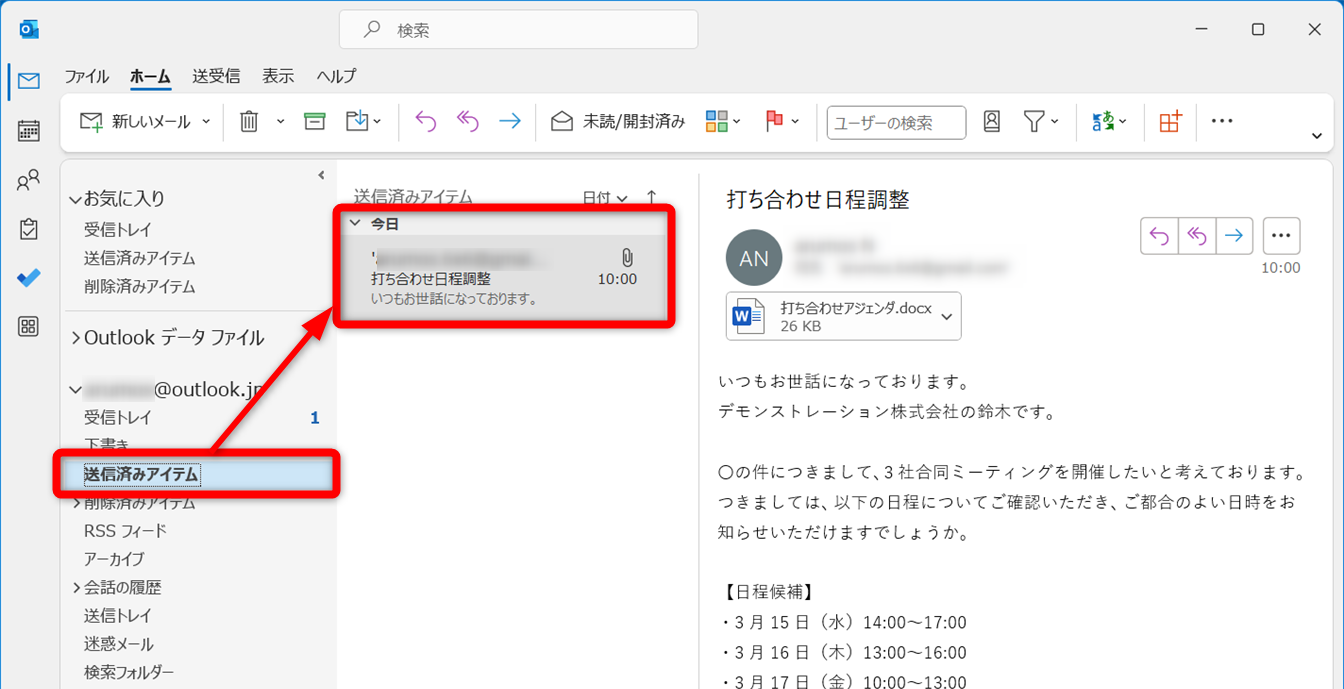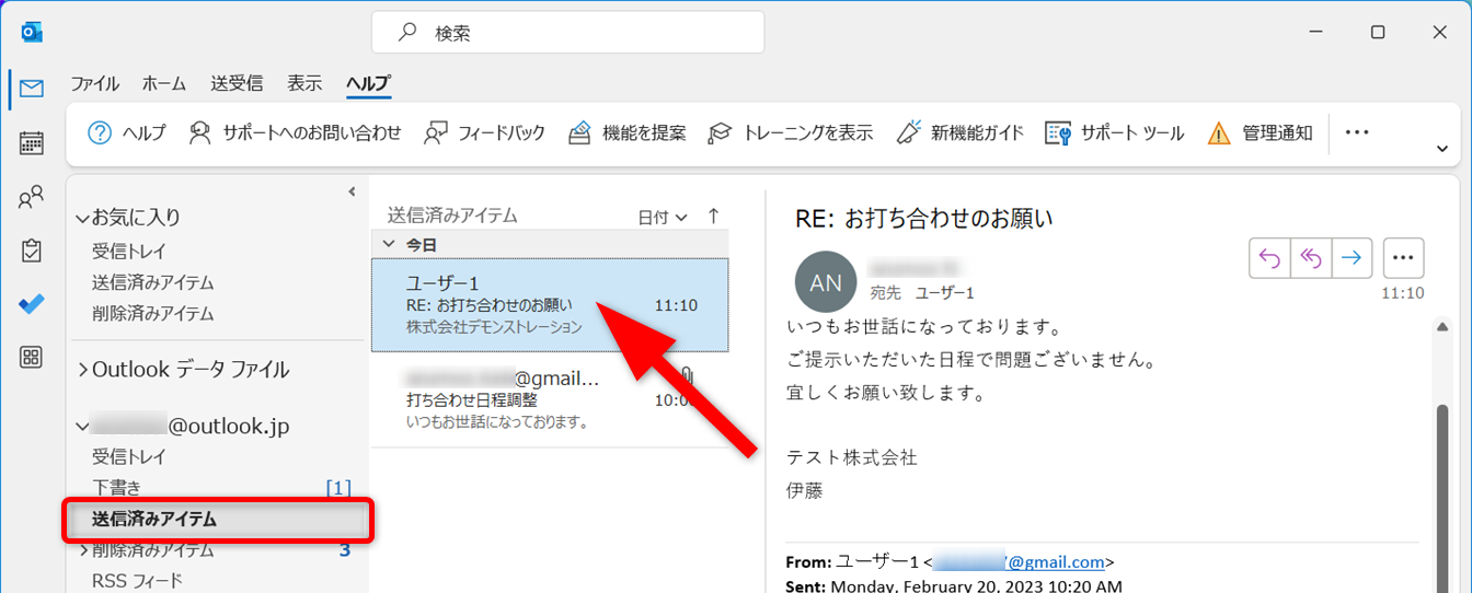 送信したメールは「送信済みアイテム」フォルダーから確認できます。