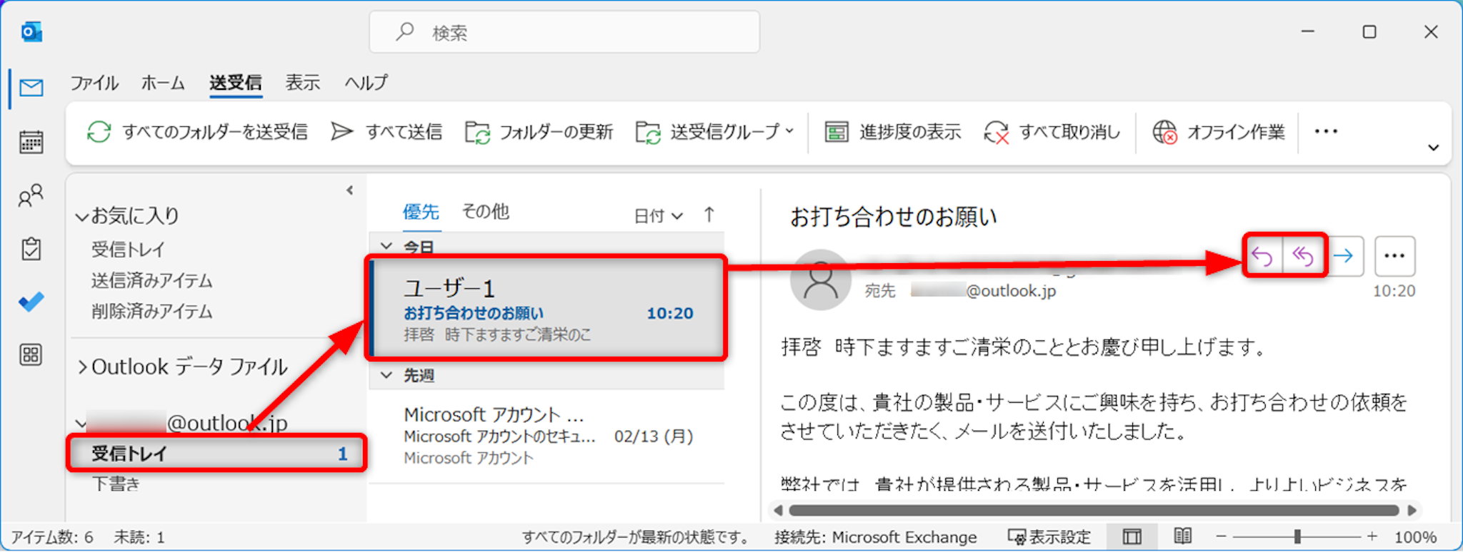 [受信トレイ]から返信するメールタイトルを選択します。