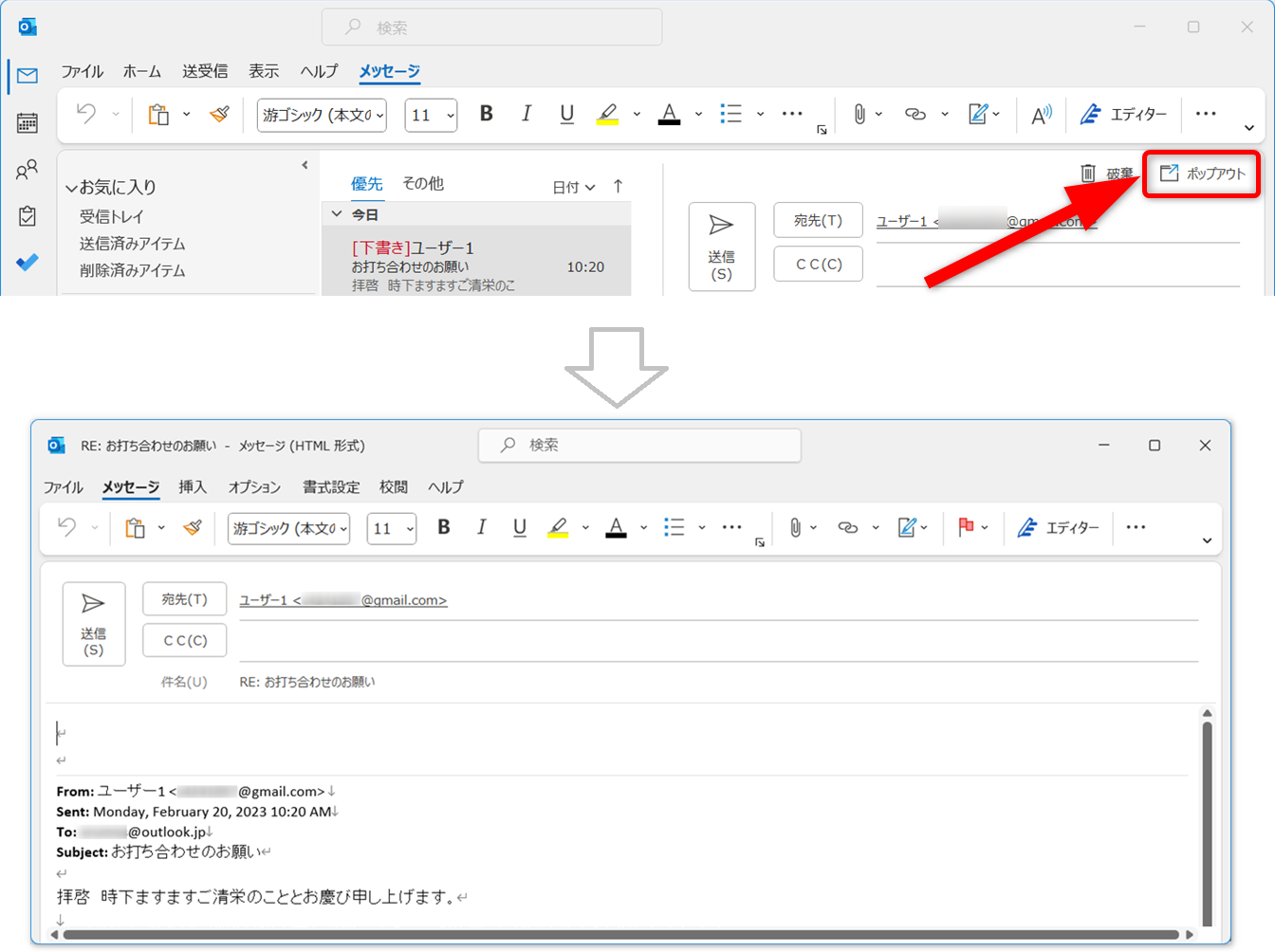 送信取り消ししたいメール(赤矢印の場所)をダブルクリックして、別のウィンドウで開きます。