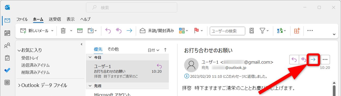 右向き矢印[転送]をクリックします。