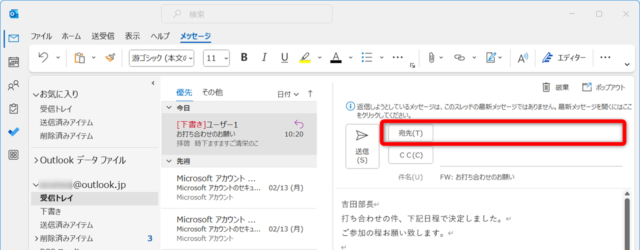 件名に「FW:」が付き、転送画面が表示されました。