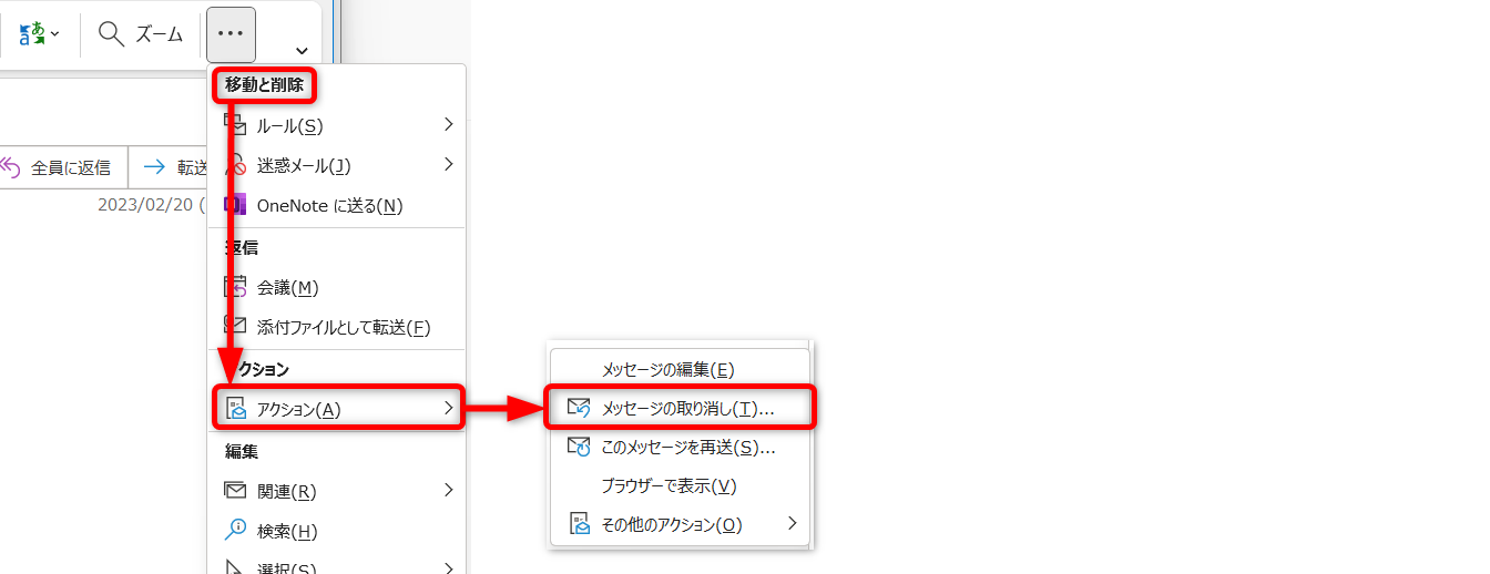 [アクション]から[メッセージの取り消し]をクリックします。