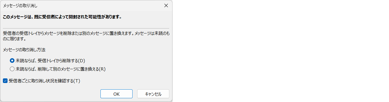 ※近年、Microsoft 365 (Exchange Online) 環境における「クラウドベースのメッセージ取り消し(Cloud-based Message Recall)」機能が強化されました。組織の管理者の設定次第では、相手が「既読」であってもモバイルアプリ等から取り消しが可能なケースが増えており、回収成功率も大幅に向上しています。