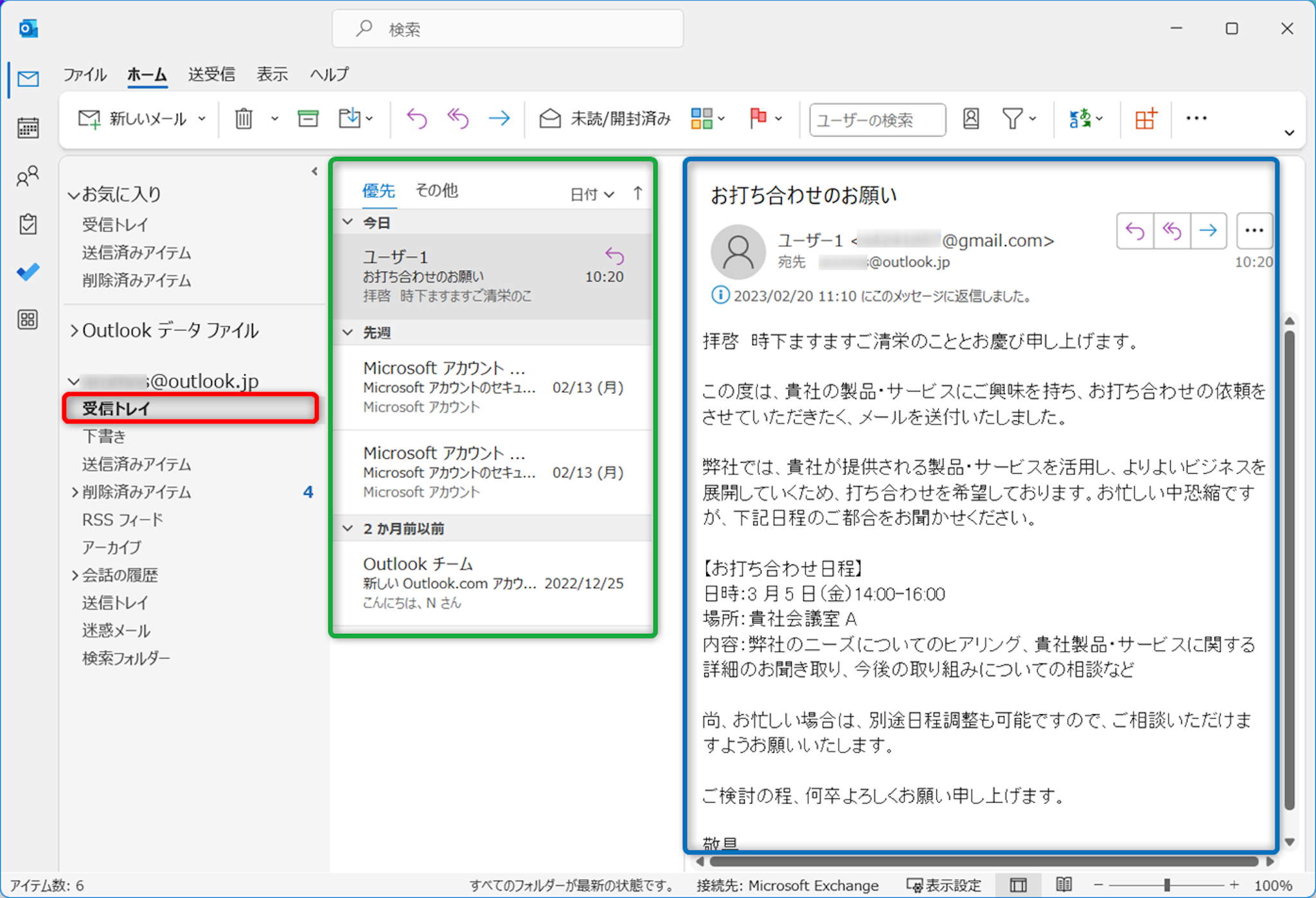青枠には選択されたメール(緑枠のグレーになっているタイトル)の本文が表示されています。