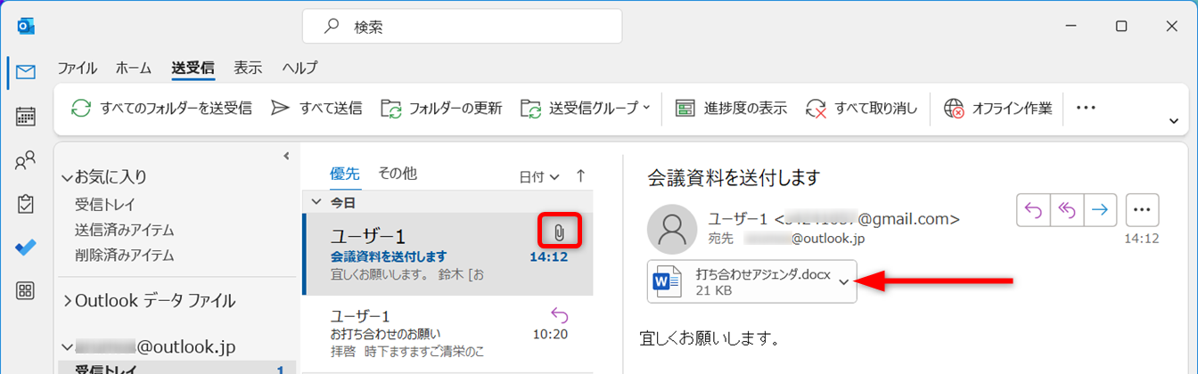 メールに添付ファイルがある場合は、メールタイトルに[クリップ]のマークが付きます。